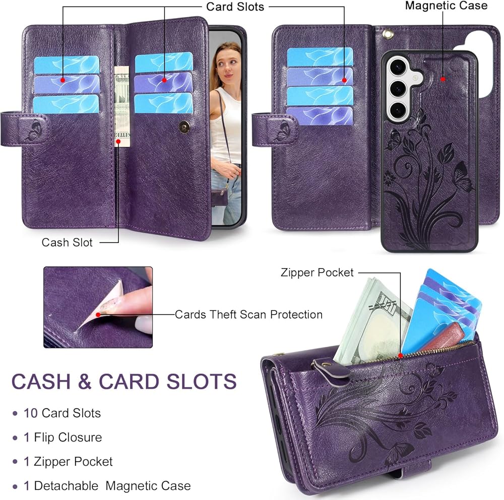 Lacass for Samsung Galaxy S25 6.2 inch Detachable Crossbody Wallet Case, Compatible with Wireless Charging, [Cards Theft Scan Protection], Magnetic Case Stand PU Leather Zipper(Floral Dark Purple)
