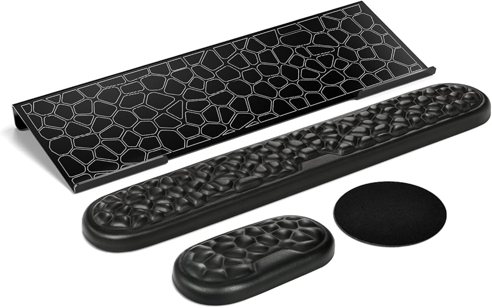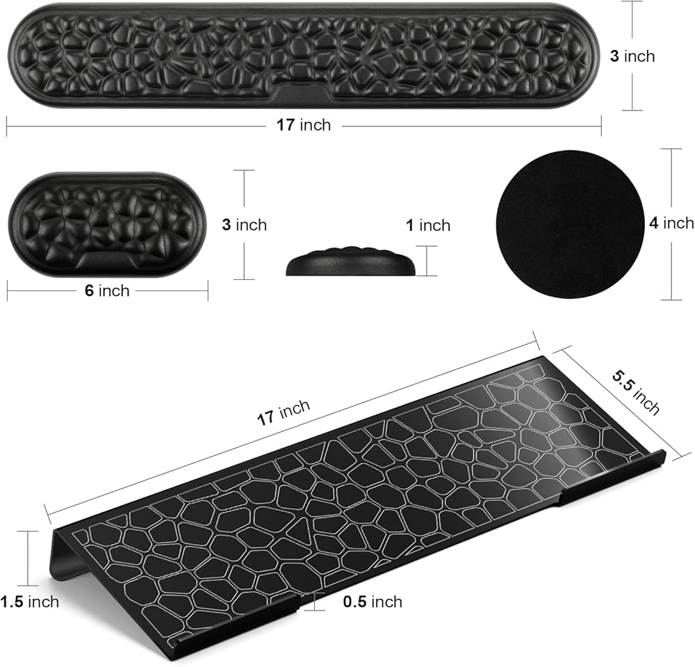 Non-slip Desk Accessories --- The Keyboard Holder has a low lip at the end to keep the keyboard stay. All of the keyboard stand, wrist rest, and coaster has designed non-slip bottom to ensure a secure grip, preventing slips and providing stability for your operation