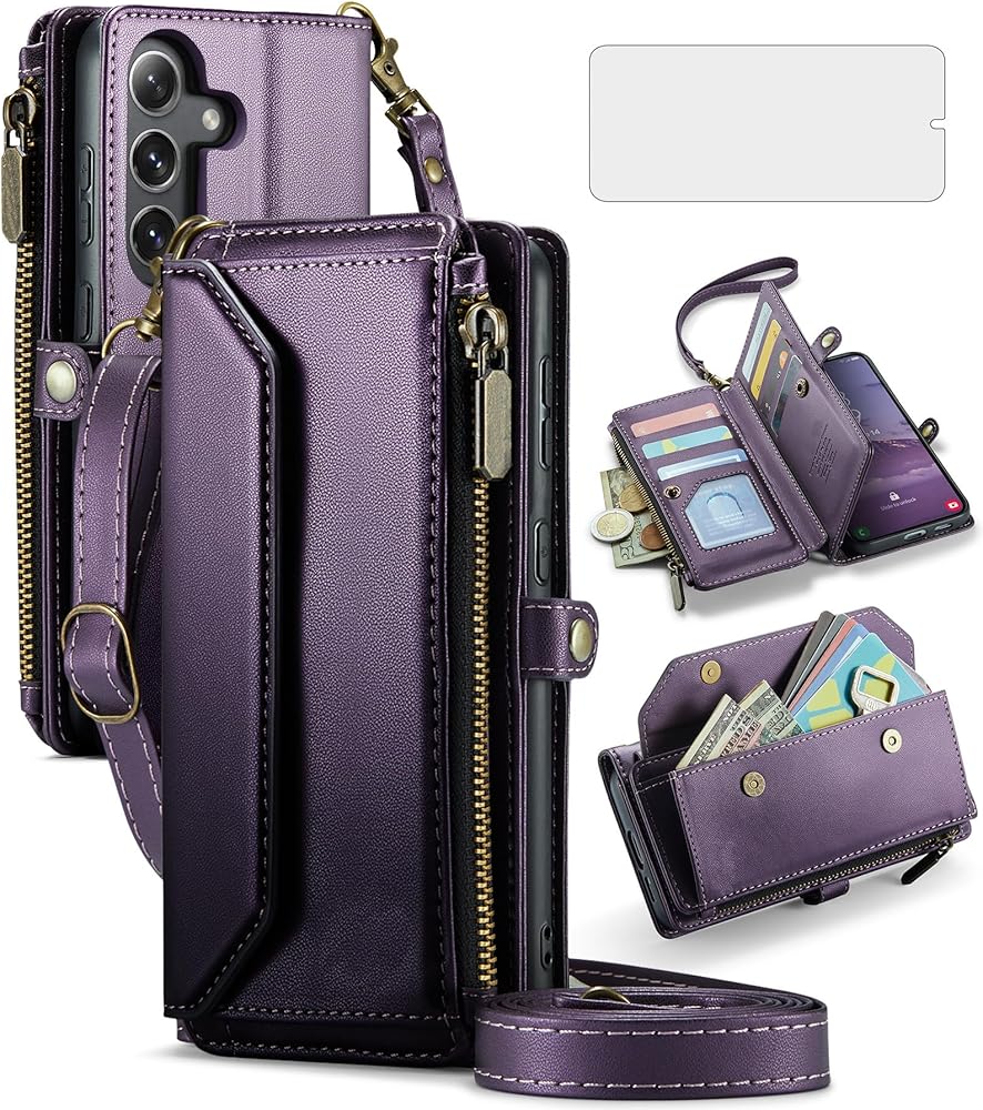 Asuwish Phone Case for Samsung Galaxy S25 Plus S25+ 5G Zipper Wallet Cover with Tempered Glass Screen Protector and Leather Flip RFID Blocking Card Holder Cell S25plus 25S + S 25 25+ Women Men Purple