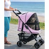 Pet Gear has really “raised the bar” with our new Happy Trails NO-ZIP stroller. No zippers means no hassle when trying to open and close the stroller. Our new NO-ZIP technology means that you can easily gain access to your pet without fumbling with difficult zippers! The Happy Trails NO-ZIP stroller also features an elevated paw rest. Your pet can easily look out of the stroller by using the front bar for support. The new panoramic view window allows your pet to remain safe inside of the stroller without missing any sights while you stroll!