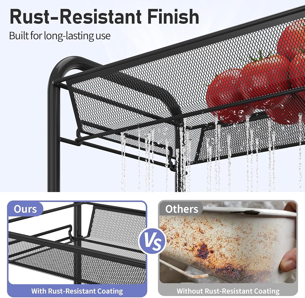 【Breathable Mesh Basket】TOOLF rolling utility cart with breathable mesh basket, effectively prevent or slow spoilage, it is also convenient for draining. Basket with 2.4" heightened basket edge to prevent items dropping and with good load-bearing capacity.