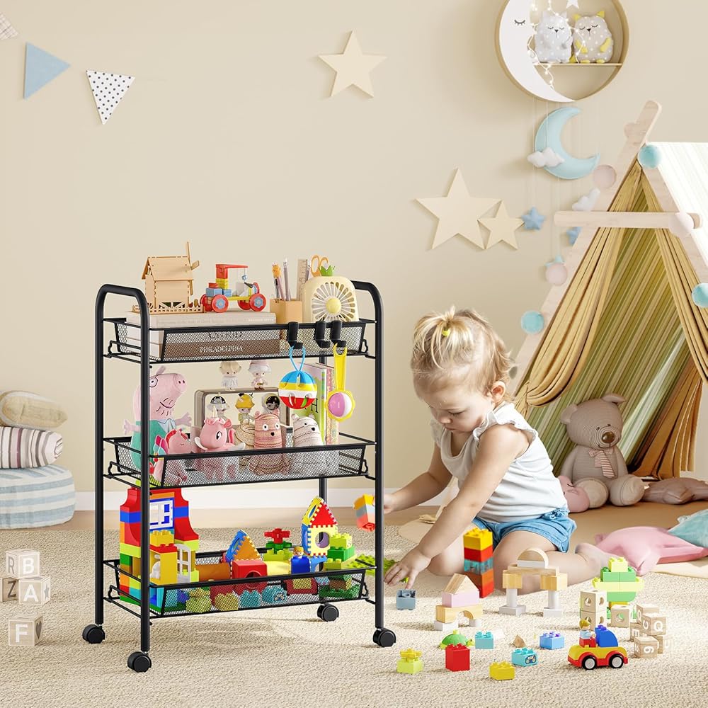 【Easily Assembled & Extra Storage】This utility cart doesn't require tools to install, so you can easily and quickly assemble the cart, just need snap the units together within a few minutes. 3 free side hooks for additional storage, like bath ball, wipes, scissors etc. It will be clearer than put essentials in a drawer.