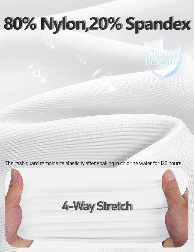 Chlorine Resistance:This rash guard is made of high-quality chlorine resistant fabric that protects the shirt from chlorine,allowing it to maintain its performance and shape after repeated use