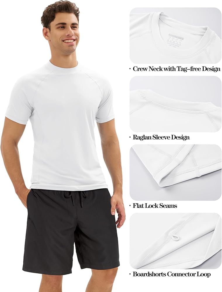 All-round Comfort:Boardshorts connector loop at the front hem that can be attached to your shorts to prevent the shirt from riding up. Stretch fabric, raglan sleeve, tag-free and flat-lock seams design provide you maximum range of motion and ultimate comfort