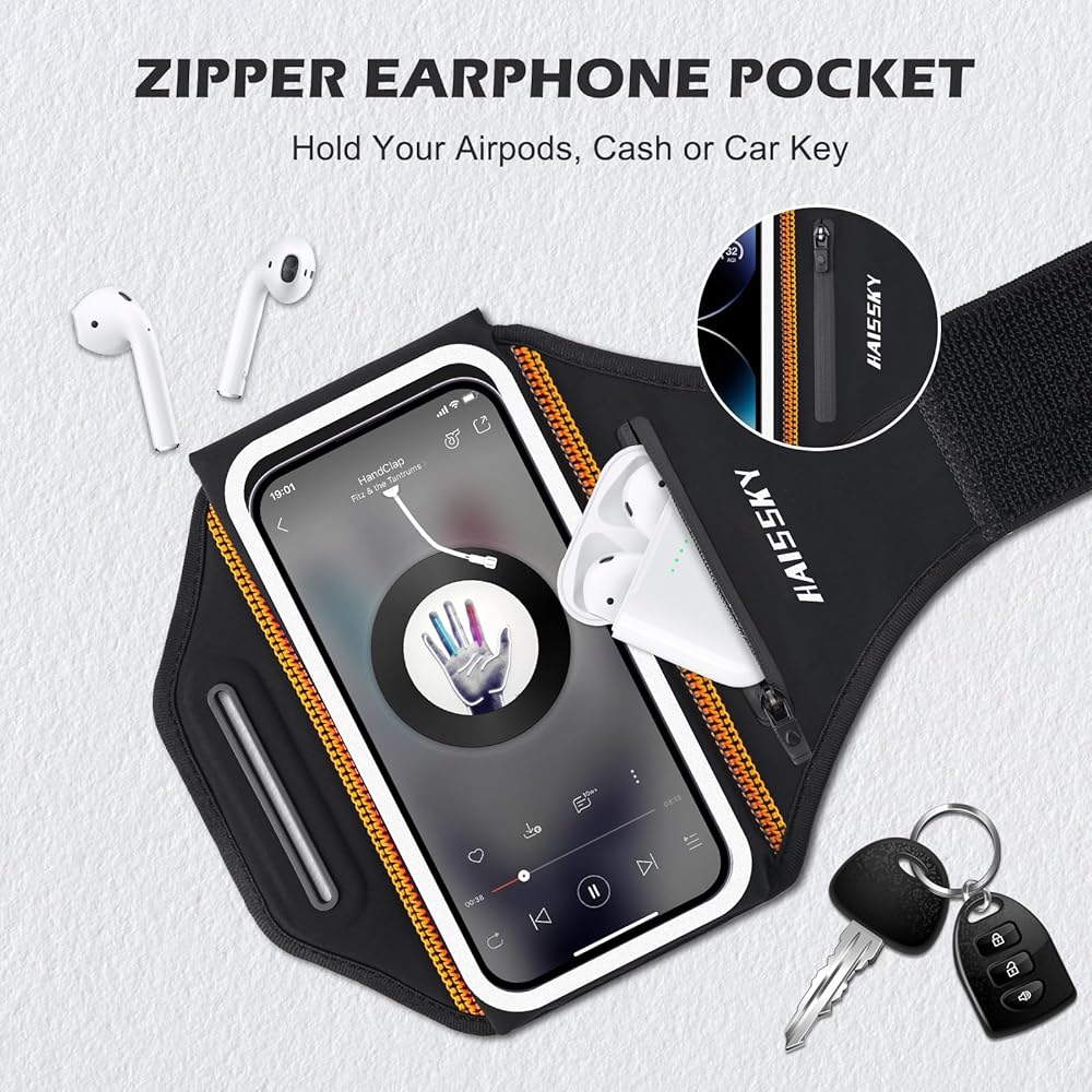 Armband With Airpods Bag - The Running Armband has a small zippered pocket on the right side. The unique zipper pocket design is not only beautiful but also practical, allowing users to store their earphones, car keys, and other small items. Additionally, A small pocket located at the back of the armband provides space for storing credit cards, cash or keys, keeping your valuables safe and secure while on the move