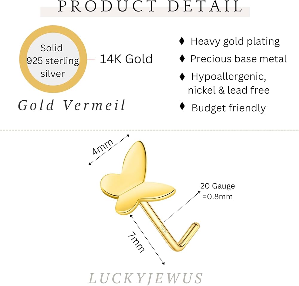 Premium Material: Our nose studs are crafted from solid 925 sterling silver and plated with 14k real gold, this gold nose ring stud promises high quality and durability. The L-shaped design ensures easy wear and prevents accidental fall-off, providing all-day comfort