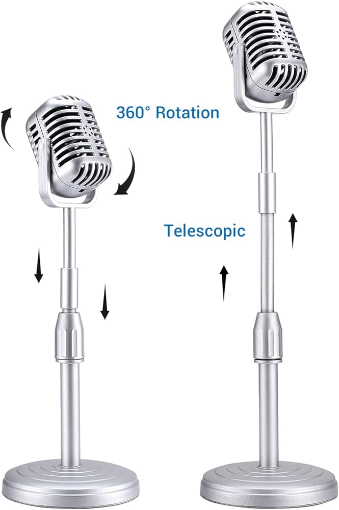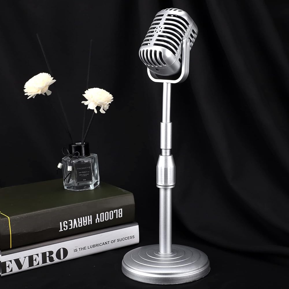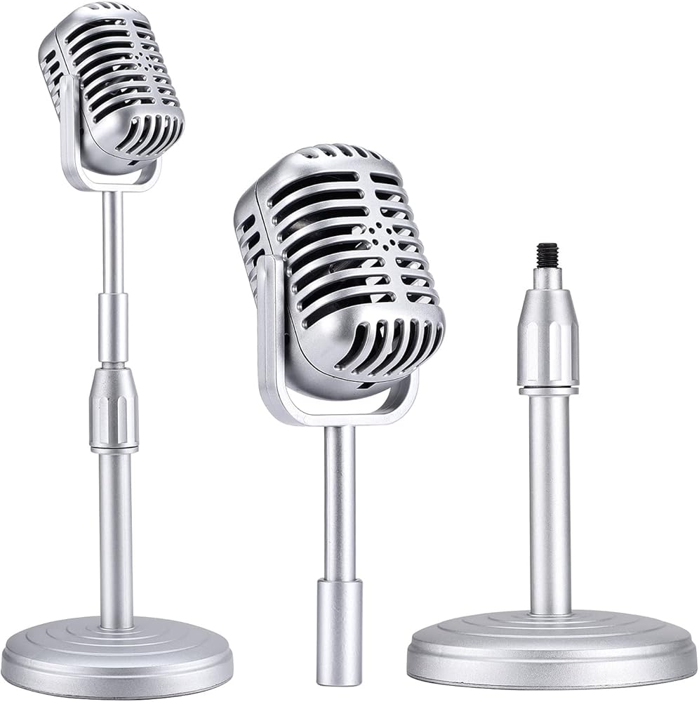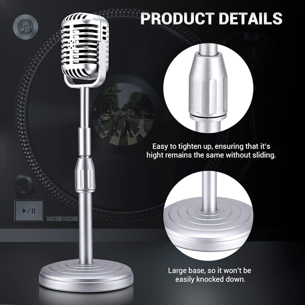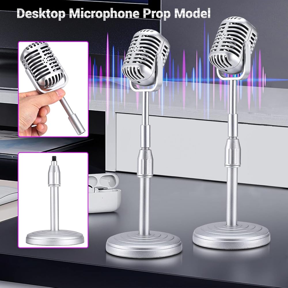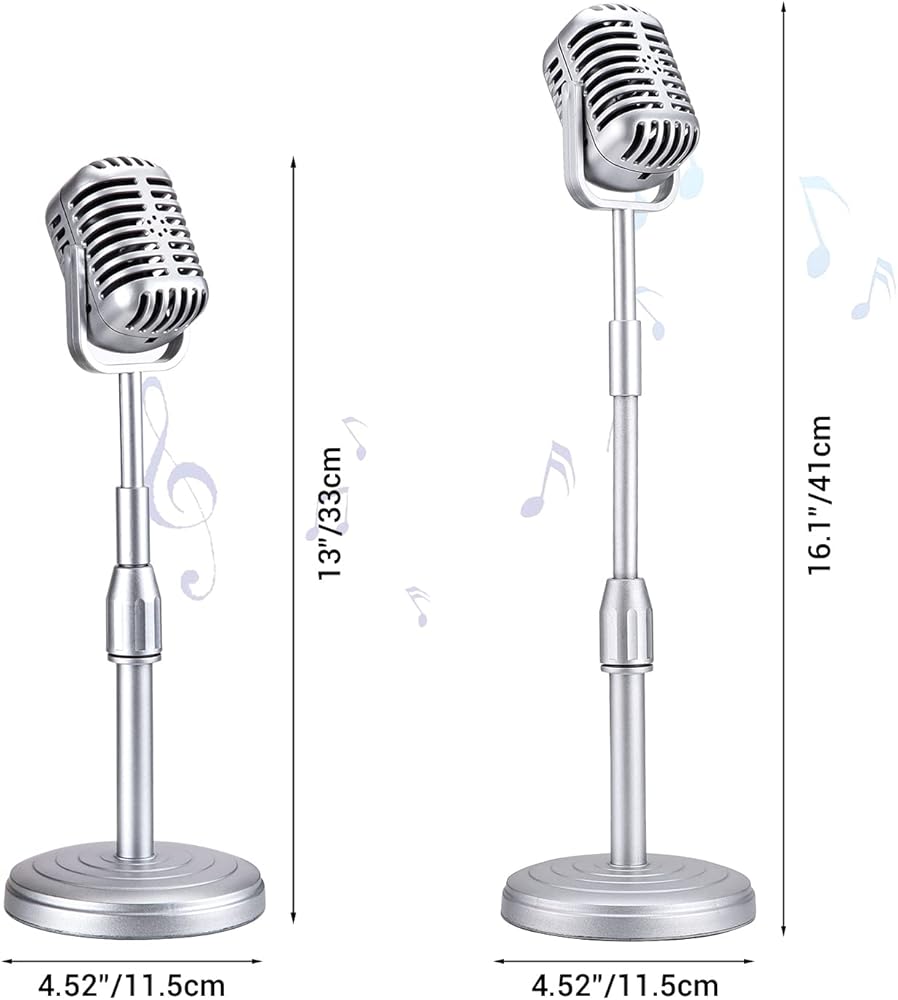 Facmogu Vintage Desktop Microphone Prop Model with Adjustable Stand, Classic Retro Style Microphone Prop Decor for Party Decoration Costume Role Play & Game Night - Silver