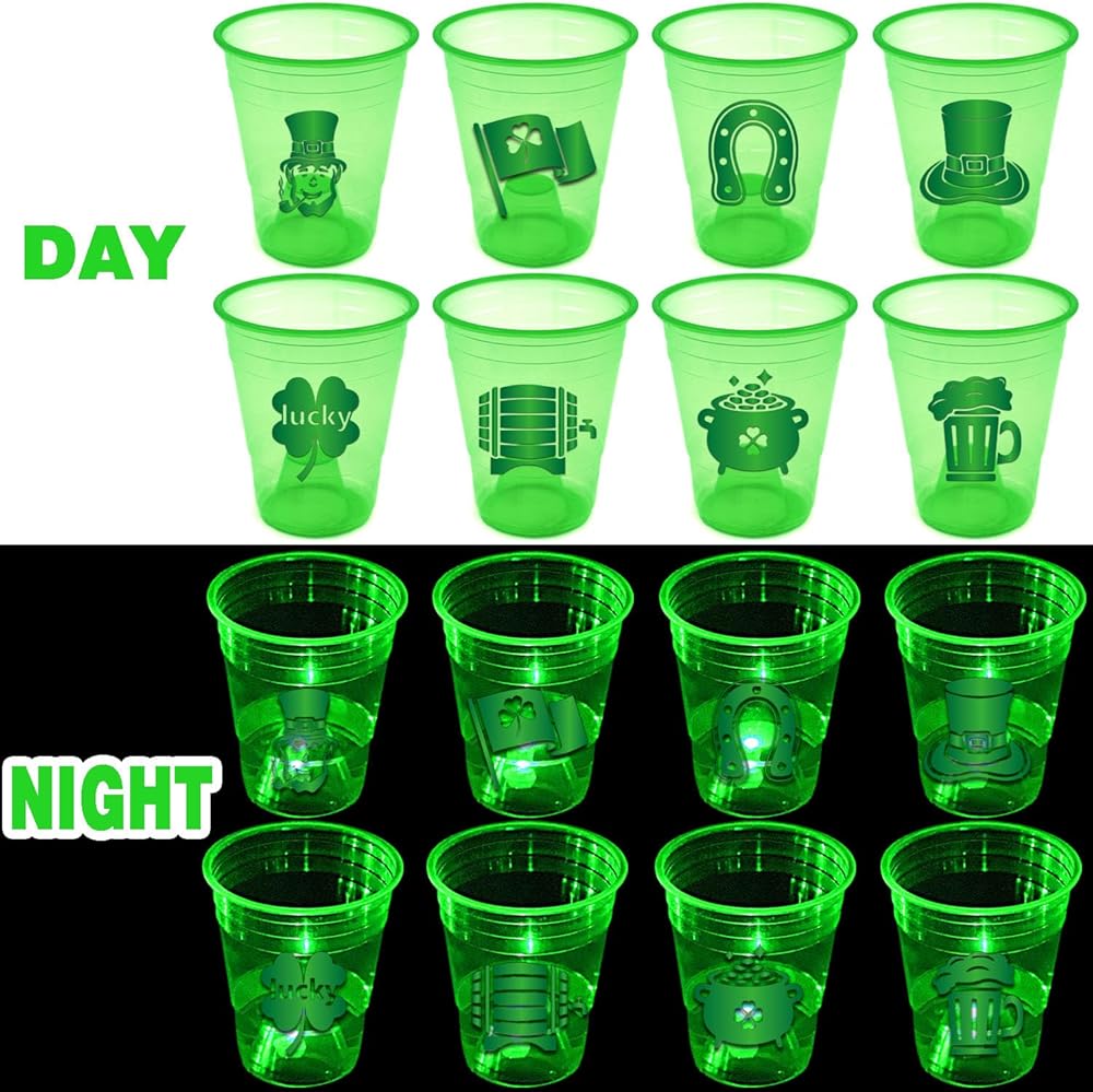 St. Patrick's Day Decor: Glow in the dark party cups perfect for St. Patrick's Day party, hight quality partyware will add a great touch to your party.