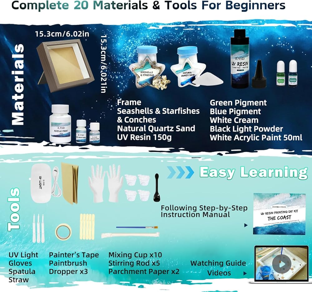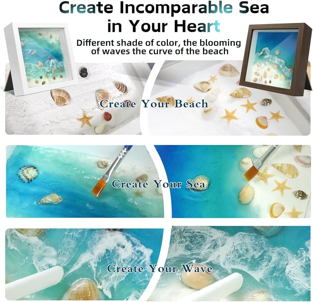 - Complete Making Kit, Beginner-Friendly: Everything is included for immediate creativity: frame, premium UV resin, UV lamp, pigments, tools, natural sand, and seashells. Just unbox and start creating your sea decor. Our illustrated guide and step-by-step video tutorials simplify every step, from gradient blending to wave making.