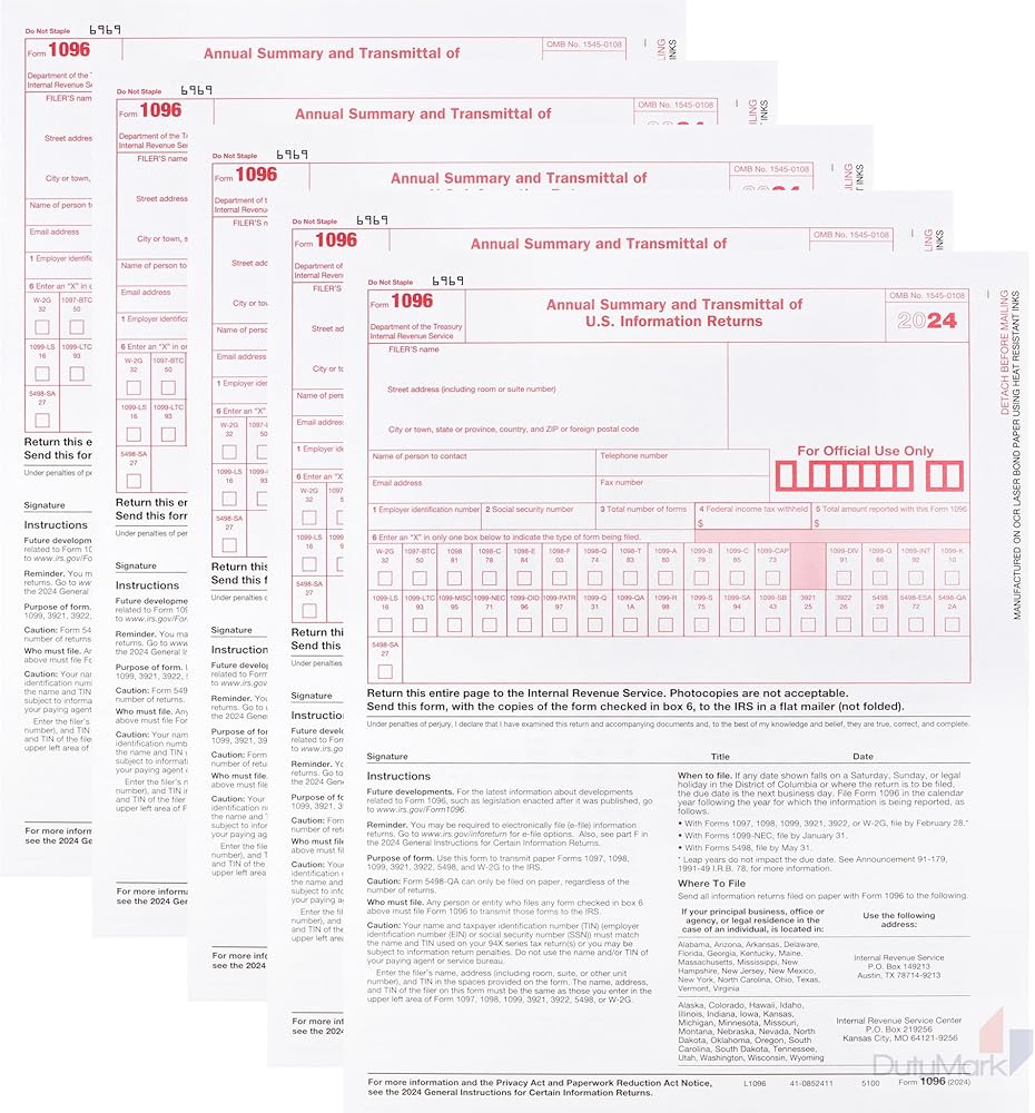 Meet government requirements with 1096 Forms! All businesses must submit a 1096 form Annual Summary and Transmittal of US Information Returns with their 1099s .