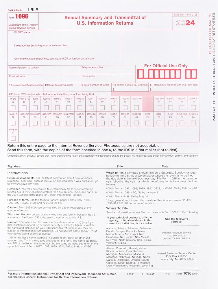 Use to summarize and transmit to the IRS all 1099, 1098, 3921, 3922, 5498 and W-2G forms. Payers must use a separate 1096 transmittal form for each type of 1099 form