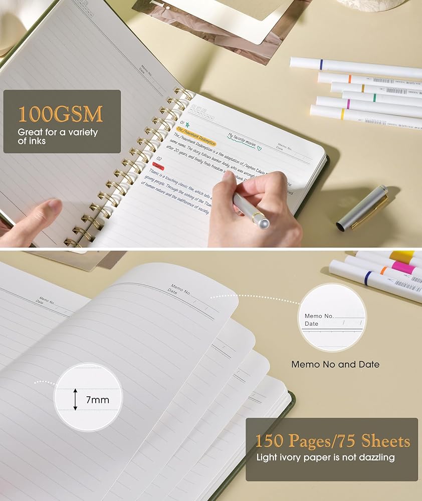 【A5 Journal with 100 GSM High-Quality Paper】 Crafted from 100 GSM thick ink-friendly paper, our notebook prevents ink bleed-through and ghosting. It accommodates various pens, including ballpoint, gel, and fountain pens. Standard 7mm-space Classic College Grid Notebook with “Memo Number” and “Date” headings on each page to help you keep track of dates. A5 size 5.75" x 8.38", perfect size for carrying around or put into your bag or purse.