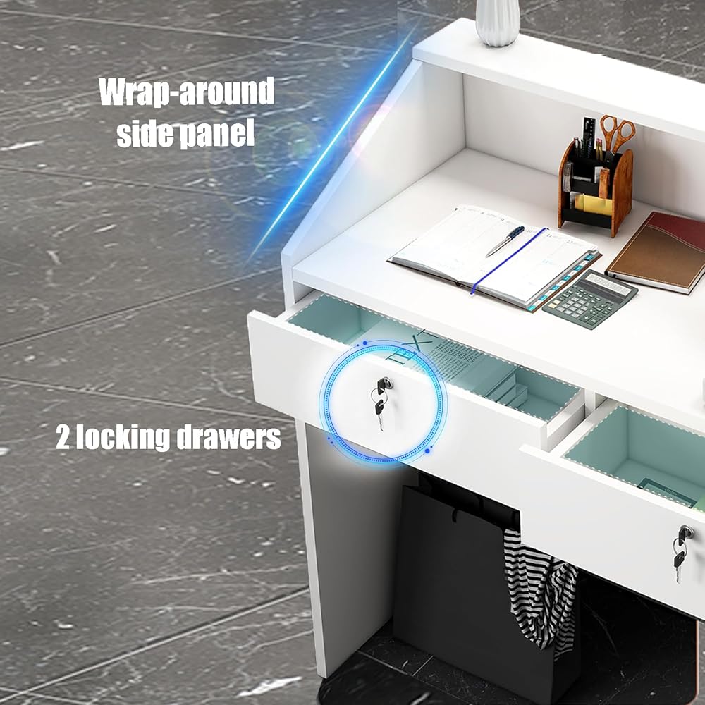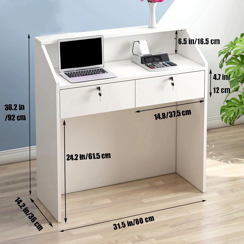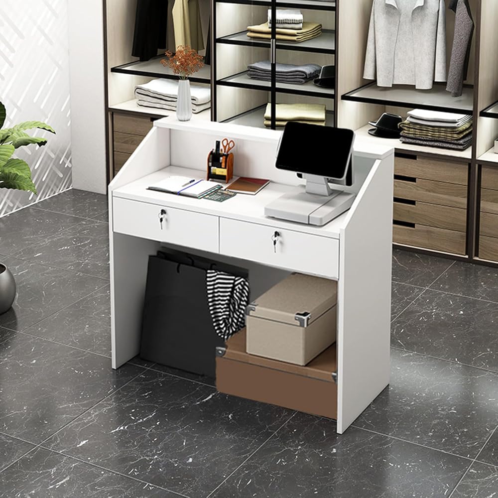 Reception Desk with Counter, Modern Front Desk with Lockable Drawers, White Retail Counter for Checkout Salon, Lobby, Store, Small Wood Cashier Table with Cable Grommet (White, 31x 14 x 36 inches)