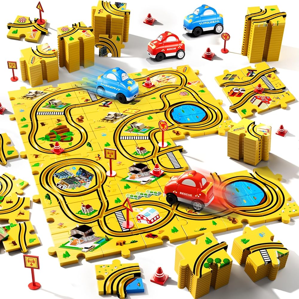 Puzzle Race Car Toy: The city-themed puzzle race car toy set includes 64 puzzle pieces, 1 red car, 1 yellow car, 1 blue car, and 6 traffic signs. These puzzle pieces can be freely combined, and children can build a variety of race tracks, and the cars will run along the roads they designed. The combination of puzzles and racing cars brings great fun, and it is a toy set that is both entertaining and educational.