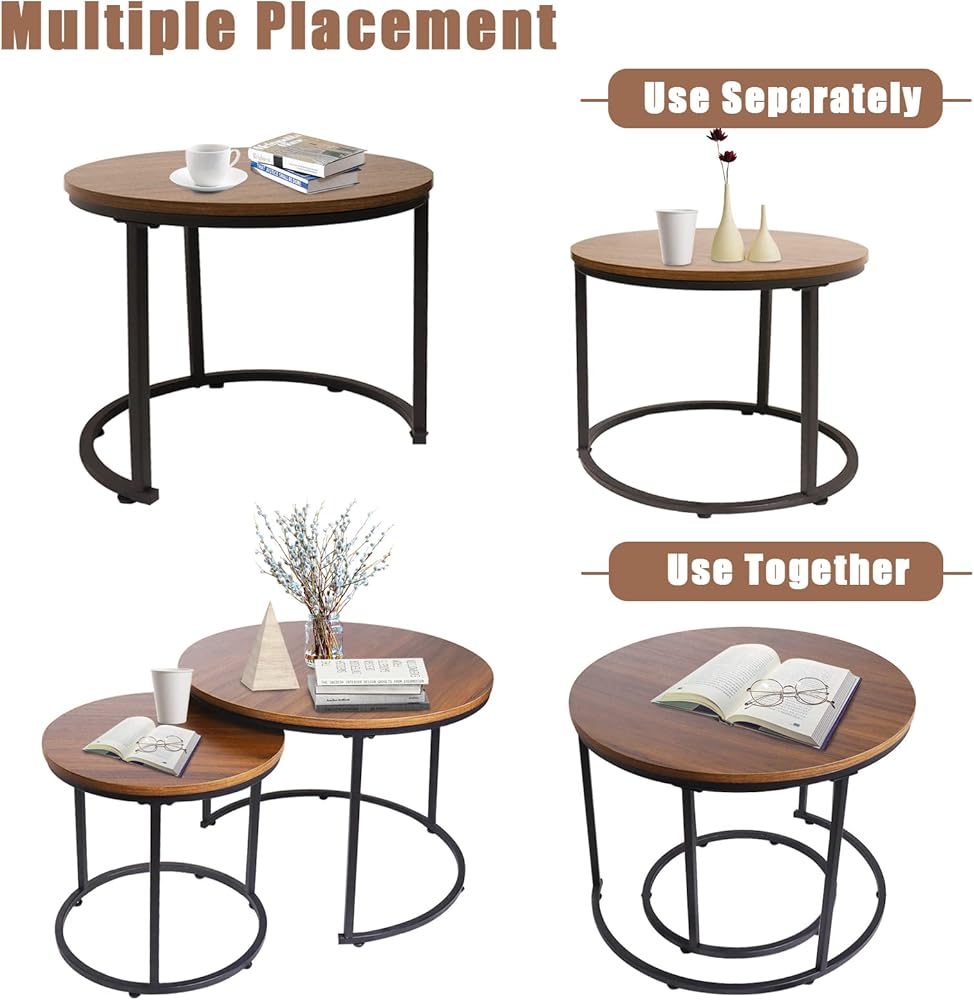 aboxoo Coffee Table Nesting Side Round Set of 2 End Table Top Sturdy Metal Frame Desk Centerpiece Living Room Bedroom Apartment Modern Industrial Simple Nightstand