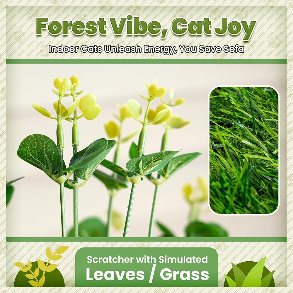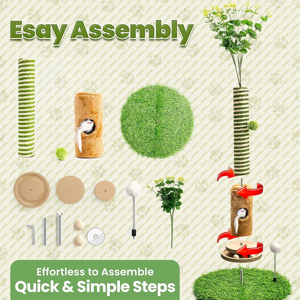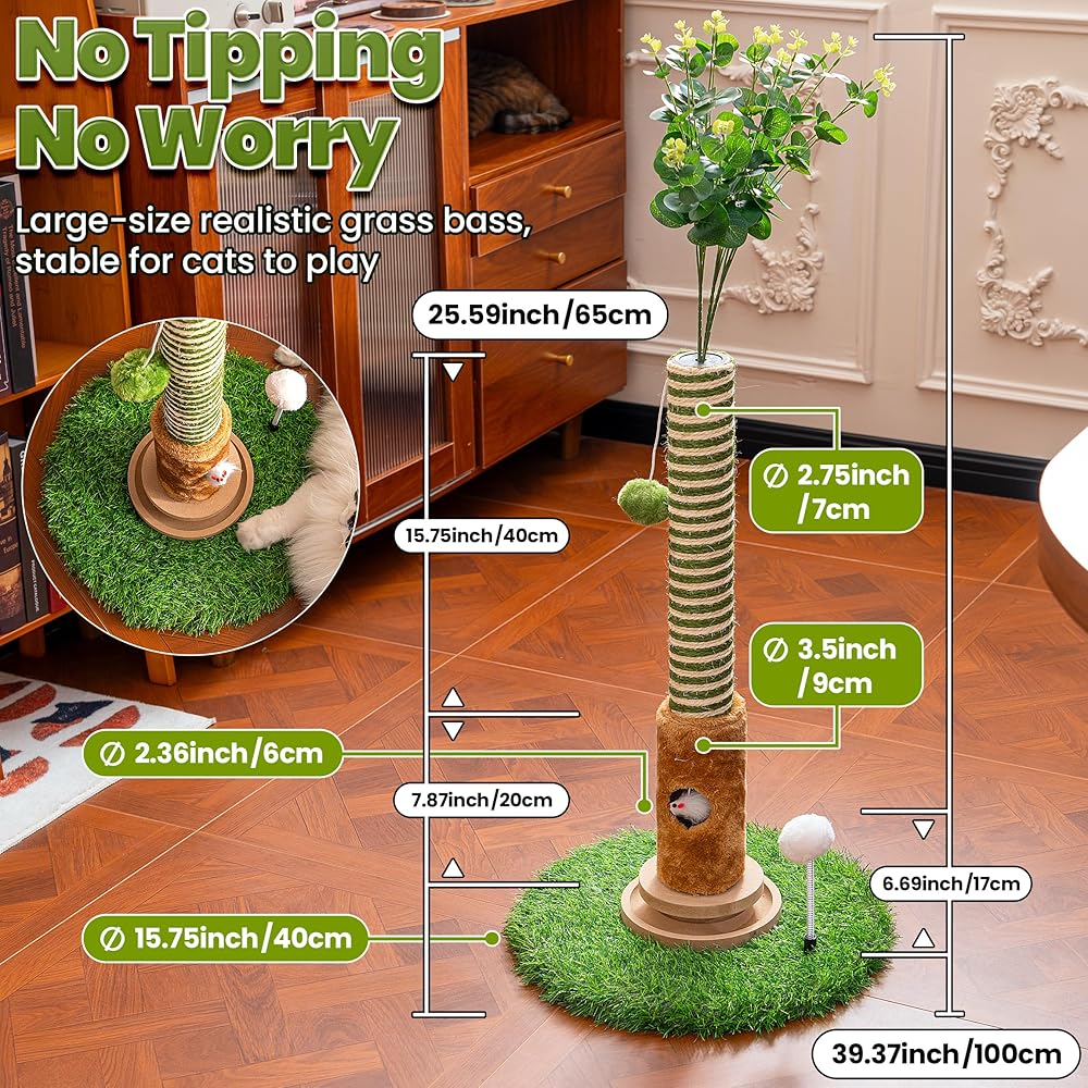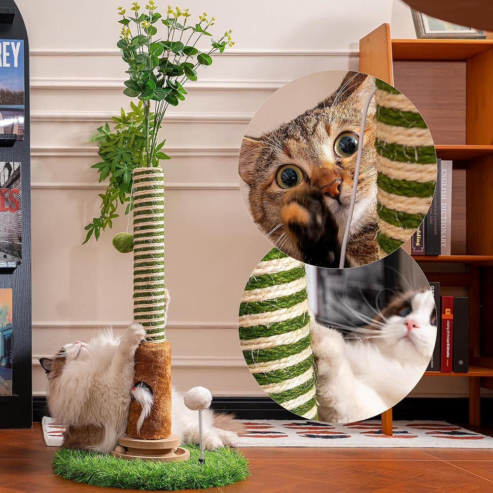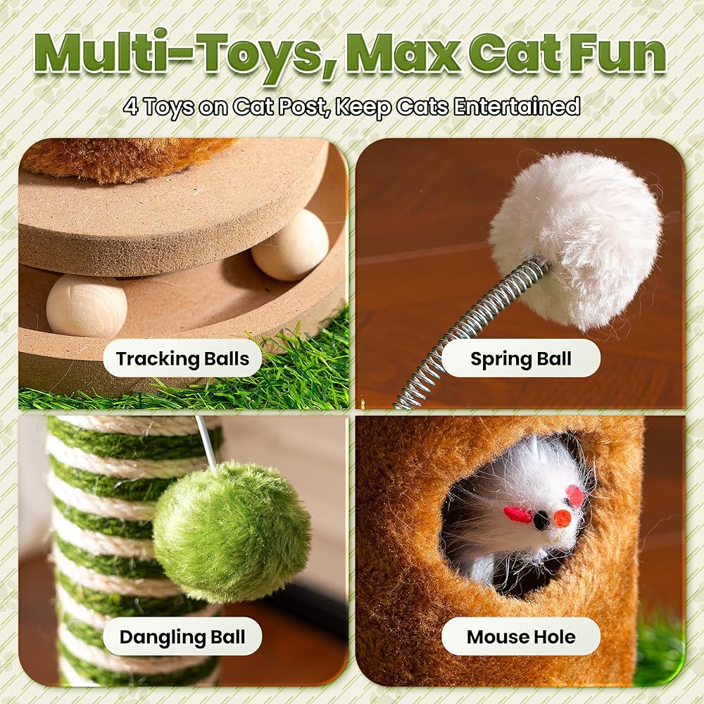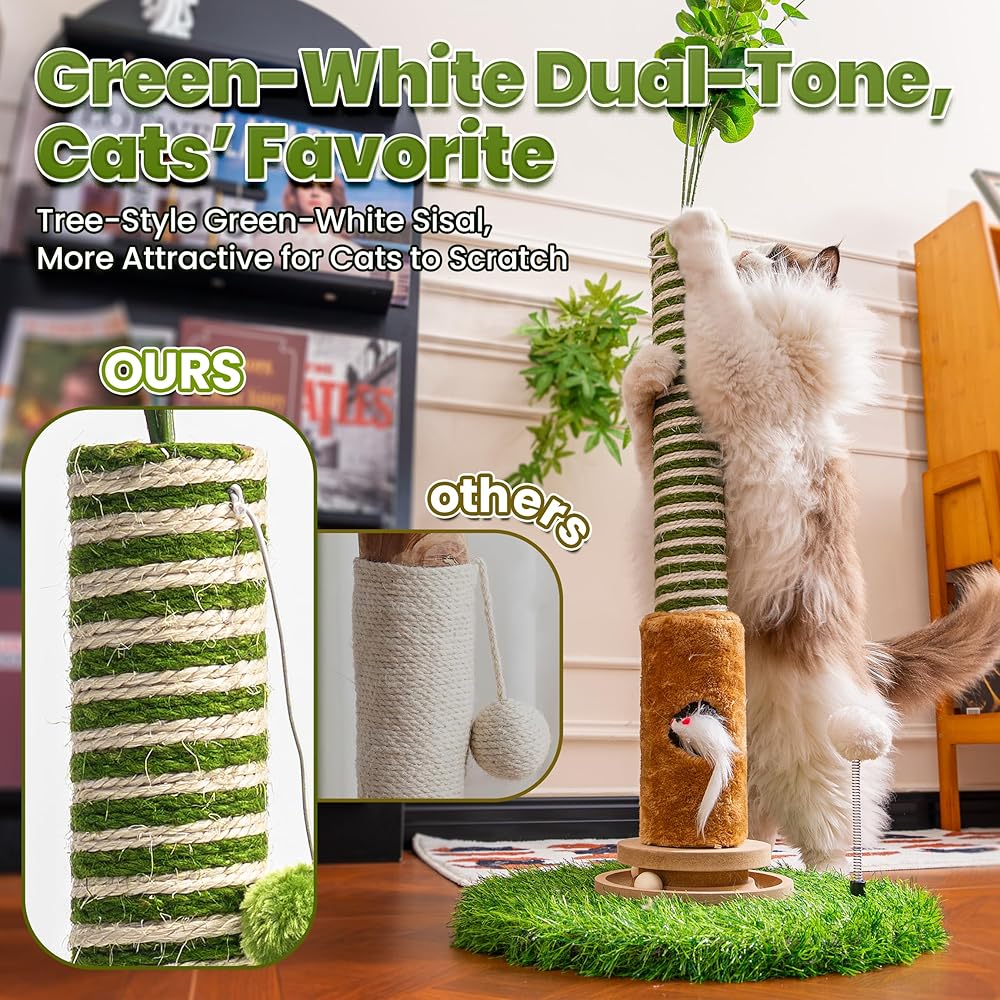 Cat Scratching Post 39'' Tall with Interactive Ball & Mouse Hole for Indoor Adult Cats, Sisal Rope Cat Tree Tower, Kitty Scratcher Furniture with Artificial Grass Tree for Kittens Cat Toys