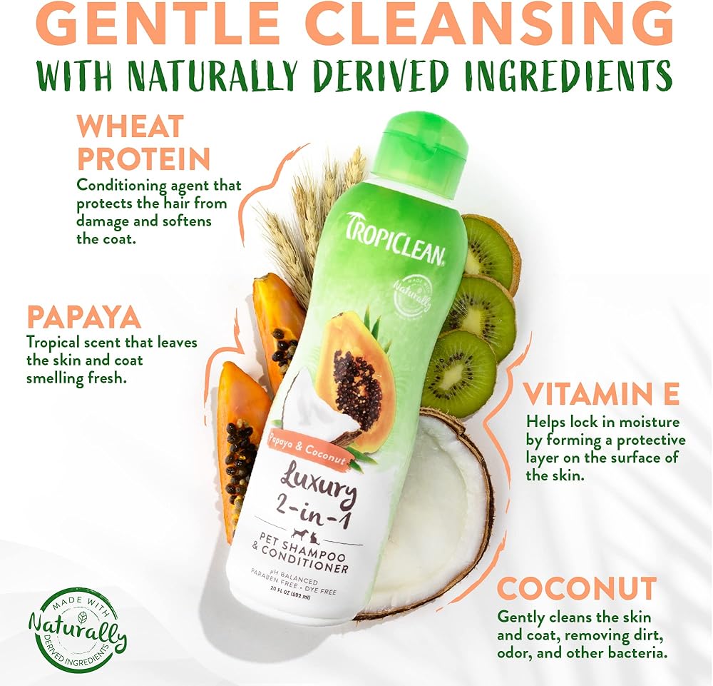 TropiClean 2-in-1 Dog Shampoo and Conditioner, Moisturizing Dog Detangler, Puppy Safe, Made in the USA, Papaya Scent, Cat & Kitten Safe, 20oz.