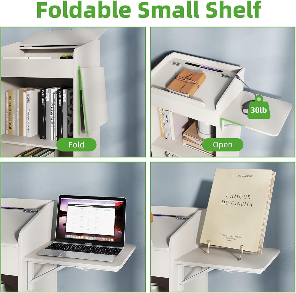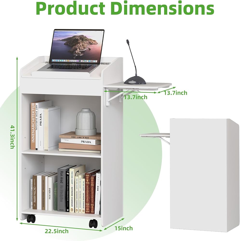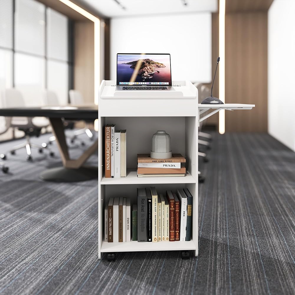 SIDE FOLDING TABLE: A foldable storage shelf is designed on the side of the podium, measuring 13.78*13.78in. It can be used to place your laptop, stationery, mugs, files, etc., increasing the usable desktop size of the podium