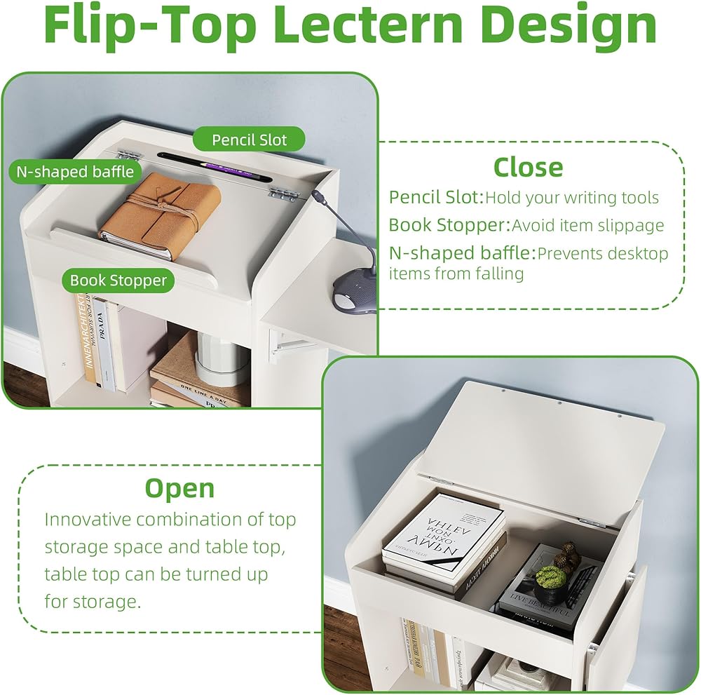 FLIP-TOP & 2-IN-1 DESIGN: The wooden lectern features a flip-top design that lifts up the tabletop to give you an extra storage space for easy access to your belongings, and lowers the tabletop to give you a spacious reading surface with bookends and pen slots for your work needs