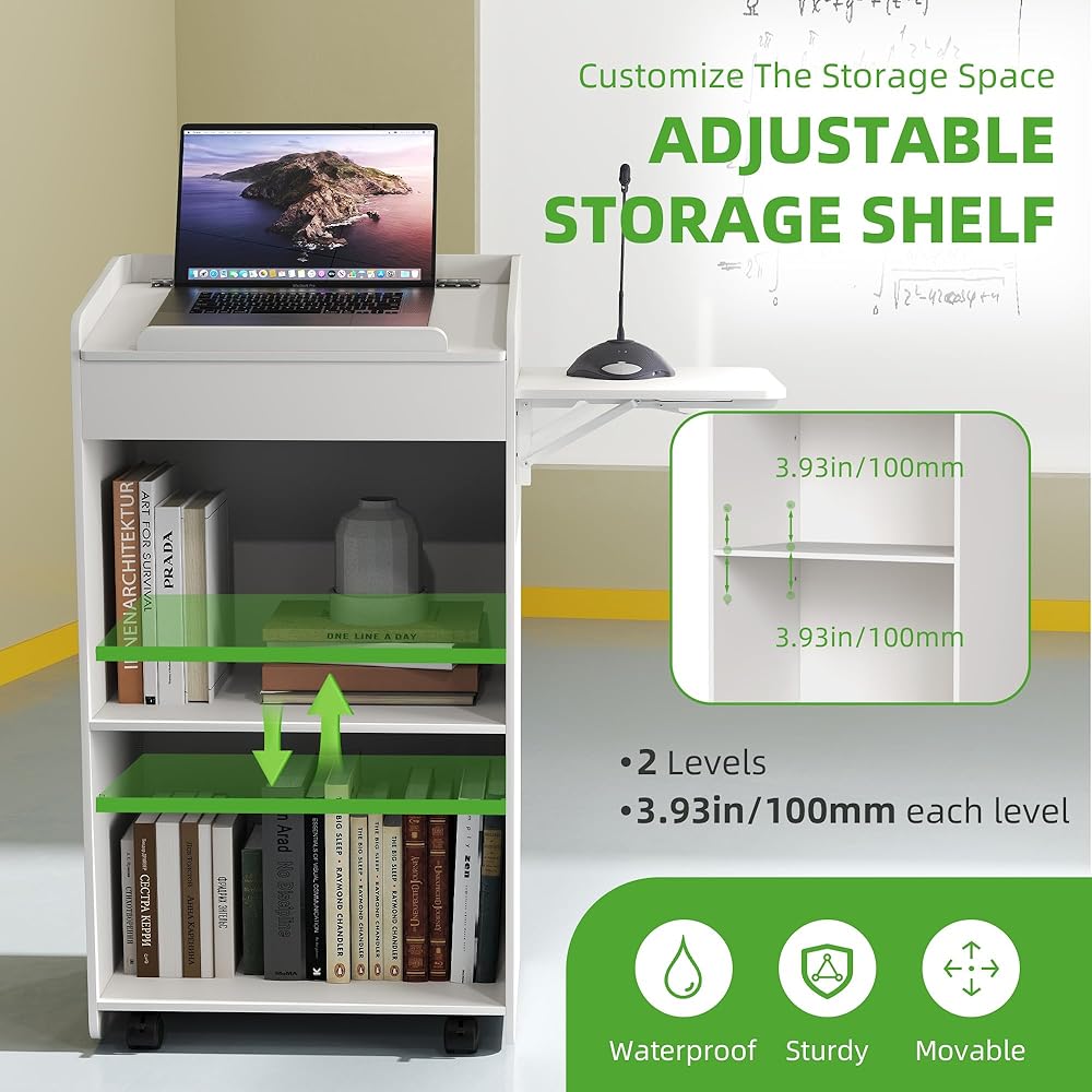 STRATIFIED STORAGE DESIGN: The wooden podium has two levels of open storage with adjustable heights that you can customise to suit your specific storage needs, making it easy to store books, boxes, pamphlets and other supplies needed for presentations