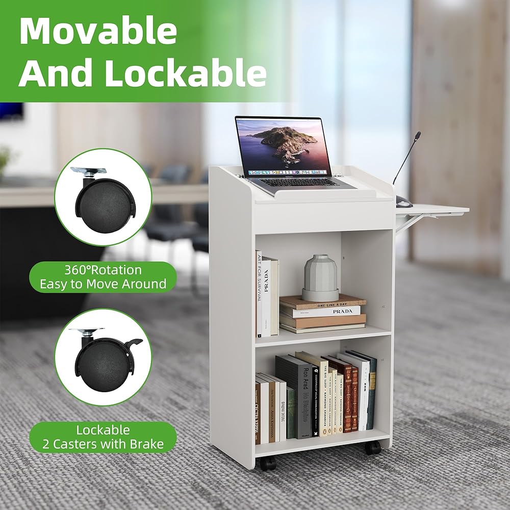 MOVABLE PULPIT: This podium stand made of superior MDF is equipped with 4 universal casters to make it easy for you to move it to where you need it. Two of them can be locked to hold the wooden podium in place while working for added stability