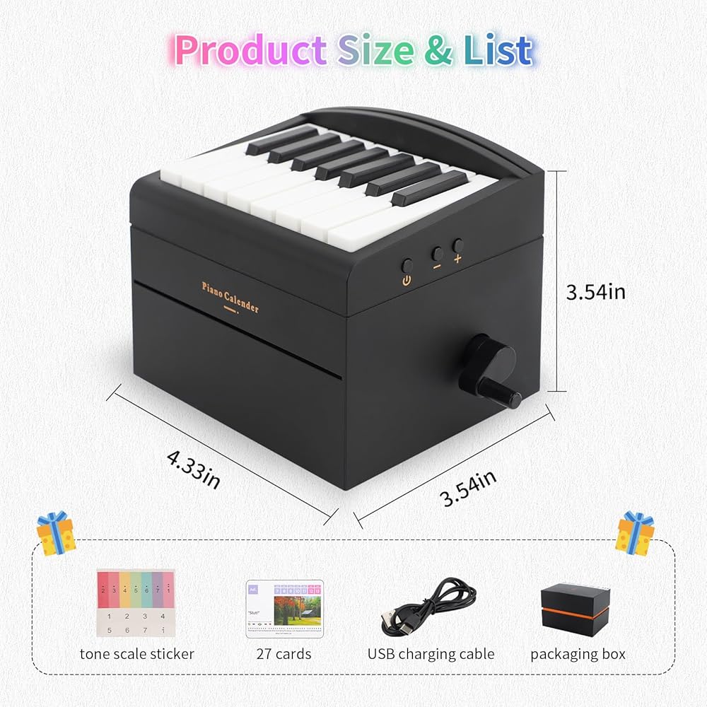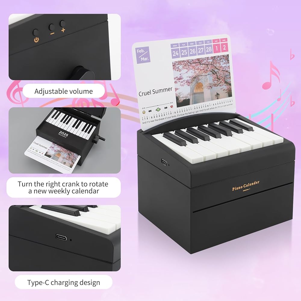PIANO CALENDAR 2025: You will receive a mini piano, 27 double-sided music calendar cards containing 52 sheets of simplified sheet music, 1 sticker, 1 USB charging cable, and 1 beautiful box. The calendar cards can be stored inside the piano and rotated to create a new weekly calendar with the turn of a crank on the right hand side, and the volume can be adjusted to provide a convenient and enjoyable out-of-the-box experience.