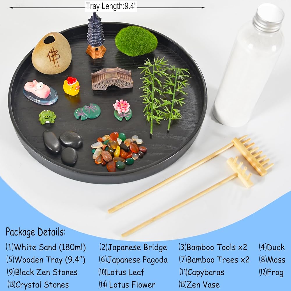 WHAT'S IN THE BOX - Round natural wooden sand tray,180ml white sand,2 Handmade Bamboo Rake Tools and 13 miniatures,including Japanese bridge, chirstmas duck,Japanese pagoda,bamboo trees x2,green moss,black zen stones x3,lotus leaf,capobaras,frog,crystal stones,lotus flower and zen vase.