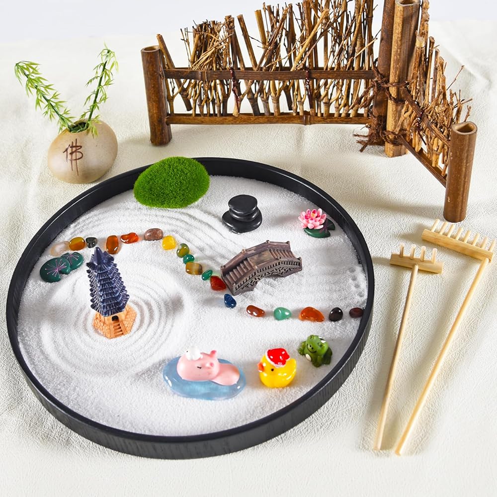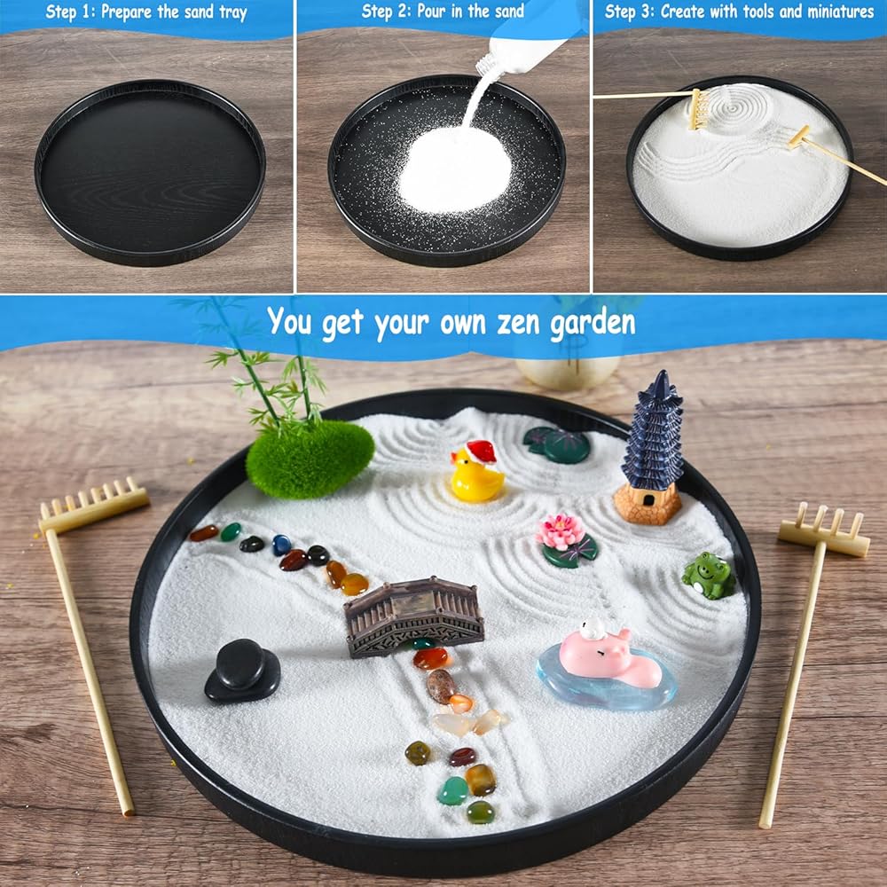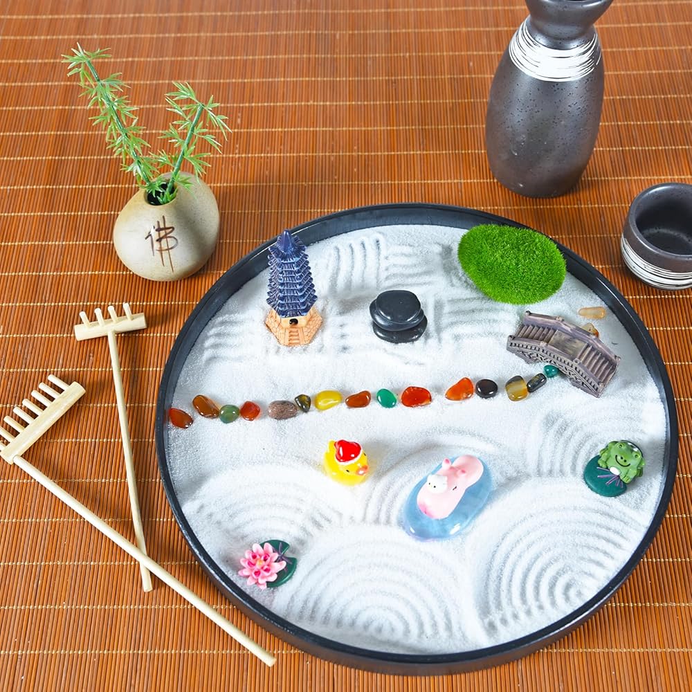 MEDITATION GIFTS - Our charming Mini Zen Garden for Desk invites users to rake patterns in exquisite, high-quality zen garden sand. It's an excellent choice for meditation gifts or introducing kids to the peaceful world of japanese garden decor.Enhance your relaxation methods with this delightful sand tray therapy kit thats ideal as a mindfulness gift or one-of-a-kind deployment gift.