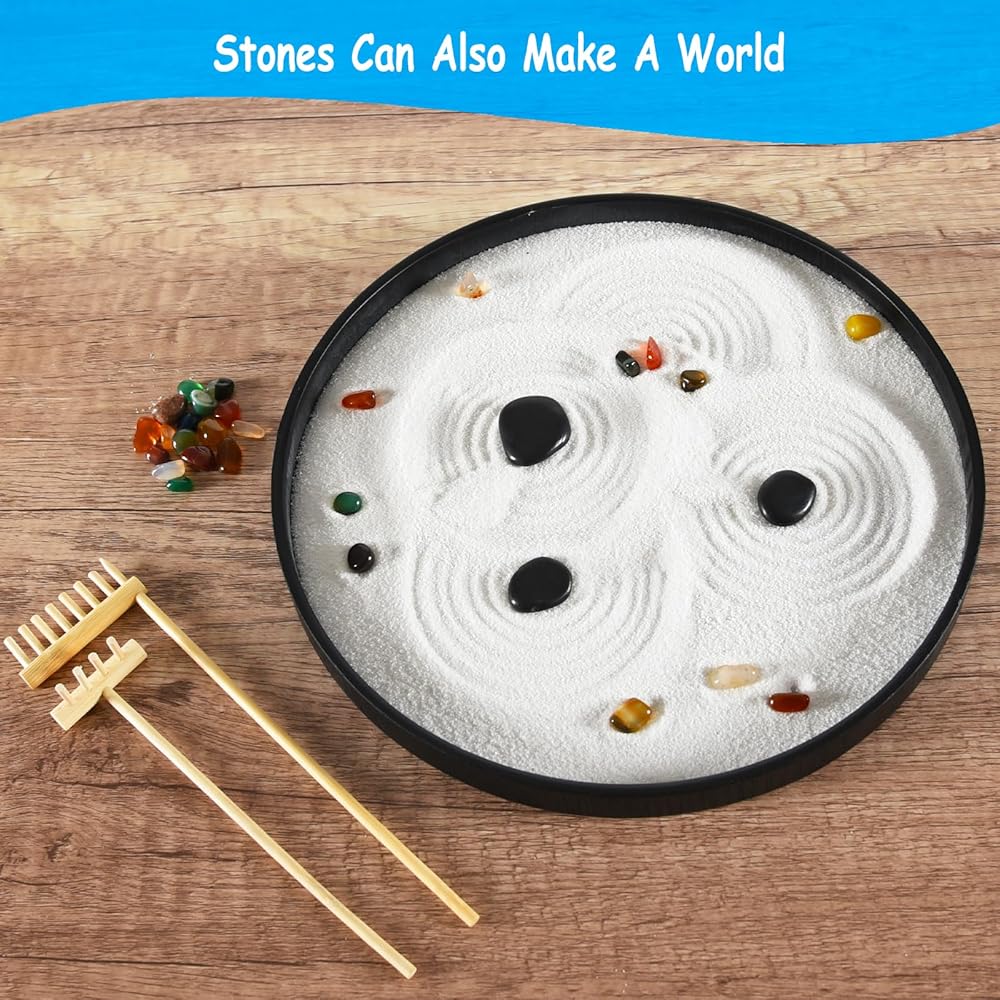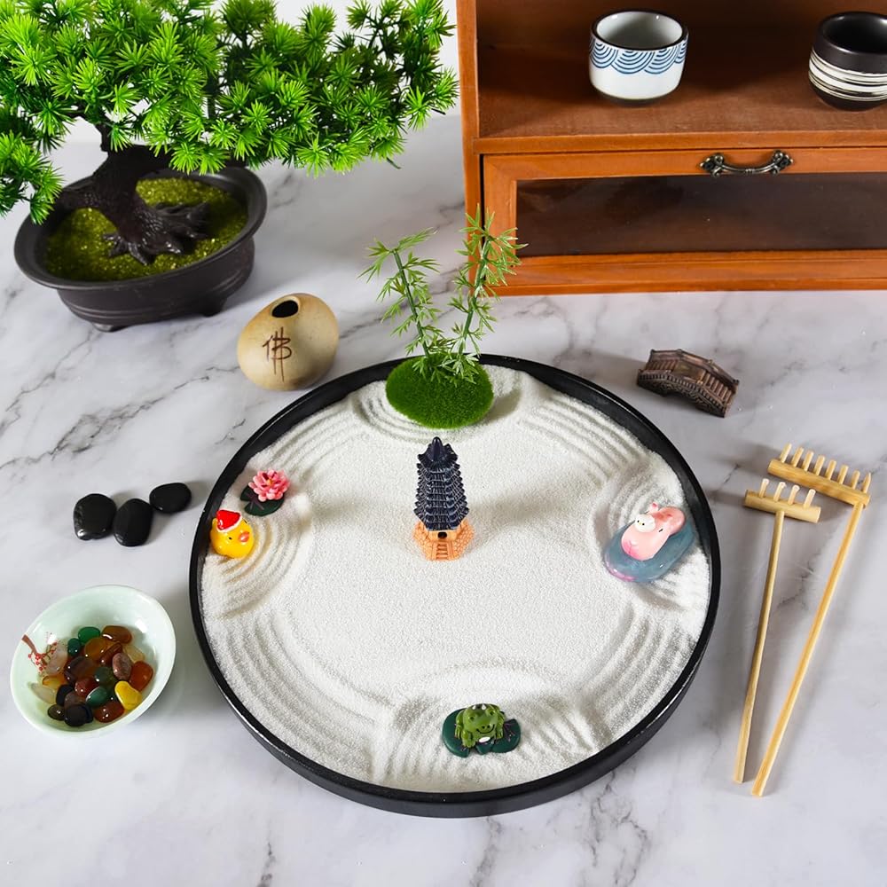 Large Zen Garden KIT - This round sandbox size is 9.4"x9.4". It contains all zen garden accessories you need.No matter in office or at home, take a break with it and you'll get your own peaceful calming zen world.