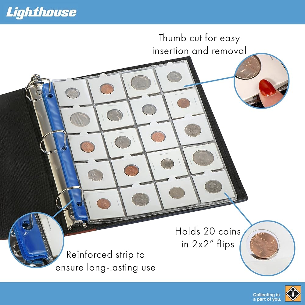 COIN PAGES: Each sheet holds 20 coin holders (2x2 size), allowing for efficient and organized coin display, and making them ideal for large collections.