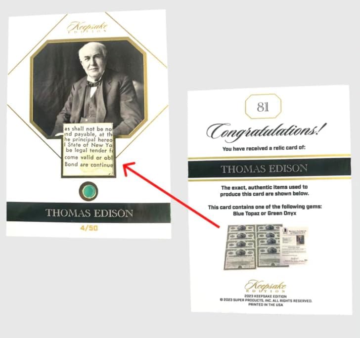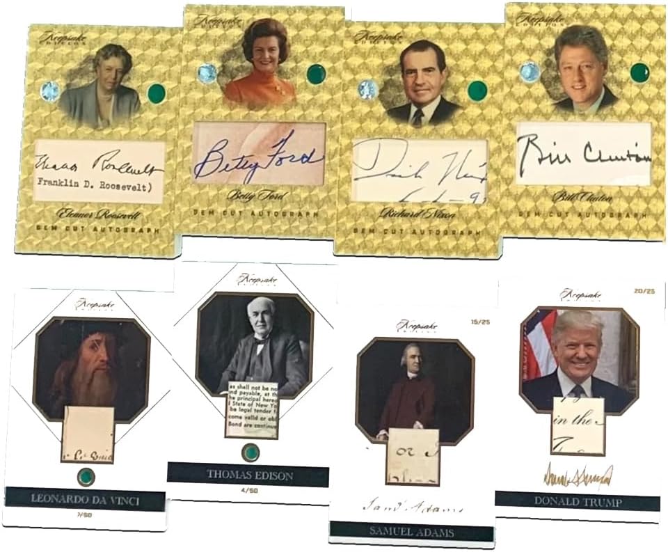 Each Box will contain: - 1 Keepsake Relic Card - 1 Keepsake Light Activated Box This set will feature relics from over 100 subjects & over 200 unique cards including: George Washington Benjamin Franklin Thomas Jefferson Albert Einstein Abraham Lincoln Martin Luther King Jr. Alexander Hamilton John F. Kennedy Leonardo Da Vinci Michelangelo Genghis Khan Sacagawea Malcolm X and more! Look for randomly inserted signatures for: - Presidents - Kings & Queens - Elvis Presley - Frank Sinatra - Thomas Edison - Franklin D. Roosevelt - Dr. Seuss - John Paul Getty - and more! Look for card featuring: - Cut Signatures - Gemstones - Diamonds - Gold - Dual Relics - Triple Relics - Quad Relics - 1/1s - and more!