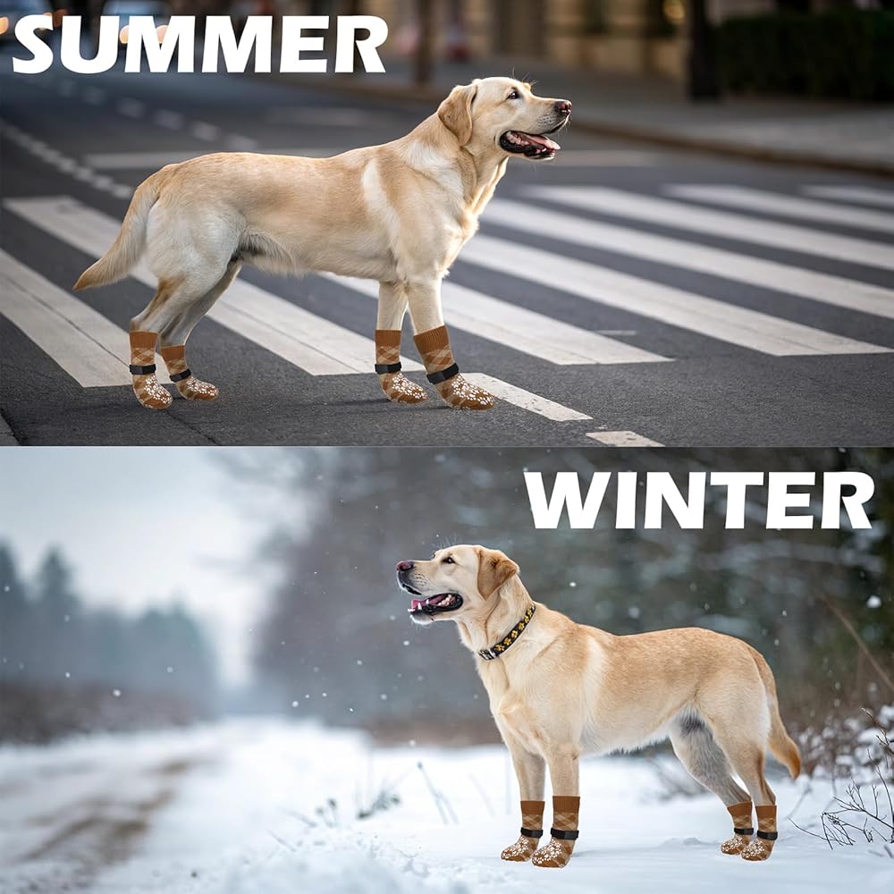 Premium Material: Our paw protector socks are crafted from breathable, soft, and elastic knit fabric for your pet's comfort. The bottom of the socks has extra-thick grip to shield your dog's paws from harsh outdoor surfaces, hot and cold pavements, and extreme temperatures. These socks create a barrier between your pet's paw pads and the ground, providing ultimate protection.