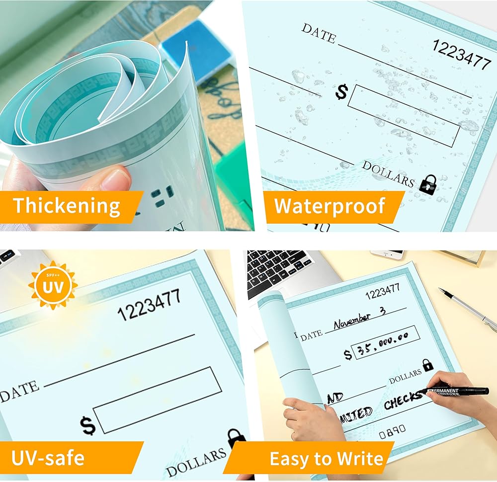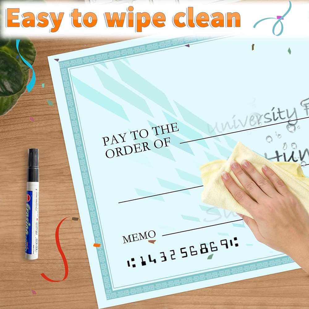 Easy to Customize: The extra-large writing space allows you to personalize the fake check with the recipient's name, amount, and other relevant details using a marker pen. You can also add your own logo to make it even more unique and memorable.Simply print your logo, cut it out, and use glue to paste your logo on the desired location.