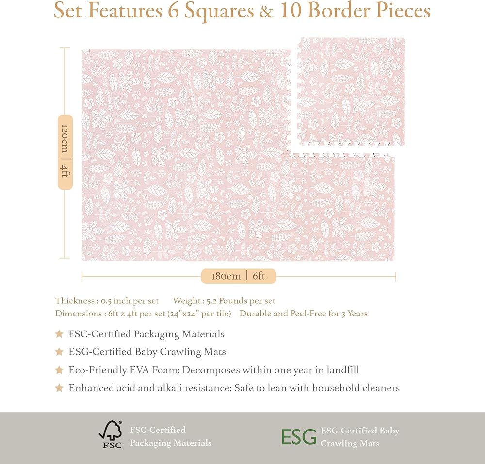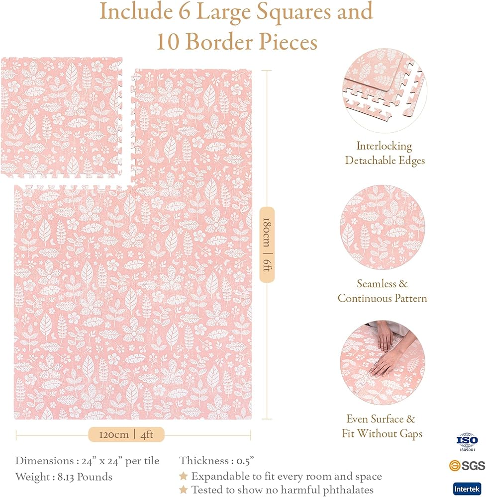 【LARGE AND THICKER FOAM PLAY MAT】The PopsyKosy playmat is a large and thick foam mat that comes with 6 interlocking tiles, each measuring 24"x24". The 0.5" thick padding provides a cushioned and safe play area for babies and toddlers, ensuring their comfort and safety during playtime. To maximize both the aesthetics and functionality of your play mat, choose a size configuration that covers the entire room/space.