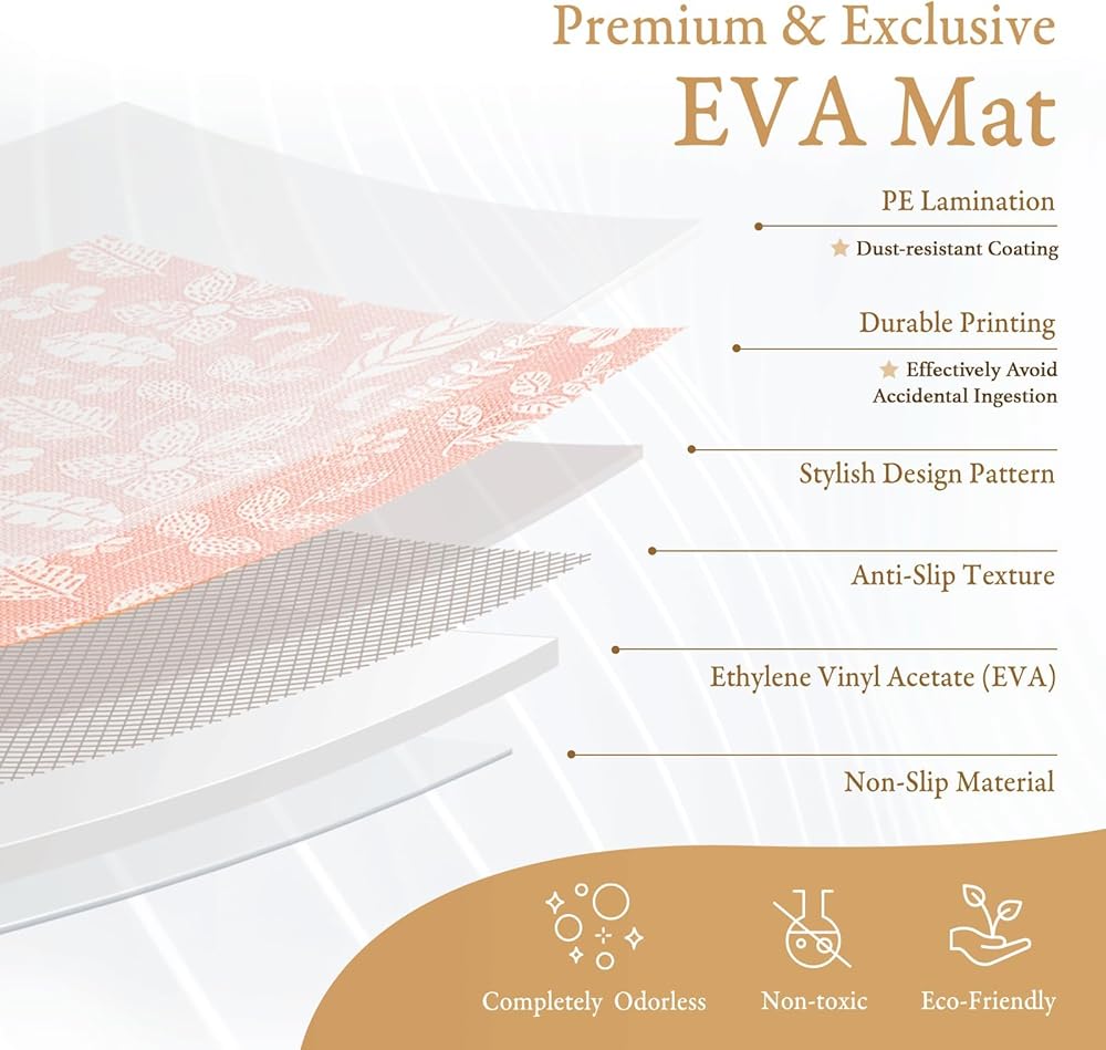 【SAFE MATERIALS】Made from durable, shock-absorbing, odorless, and non-toxic EVA foam, our mats ensure safety and comfort. Using a unique printing method, it effectively addresses issues like sun fading and peeling that other brands often encounter, prevents small pieces from breaking off and being accidentally swallowed by babies, and enhances overall durability. With zero-benzene technology, it eliminates toxic odors found in many commercial products, ensuring non-toxic and safe floor mats.