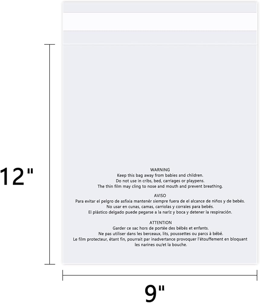 [Specifications]- 500 Pcs - 9" x 12" Usable Dimension (Excludes Glue Flap). 1.6 Mil Thickness poly & plastic packaging bags Printed with Suffocation Warning