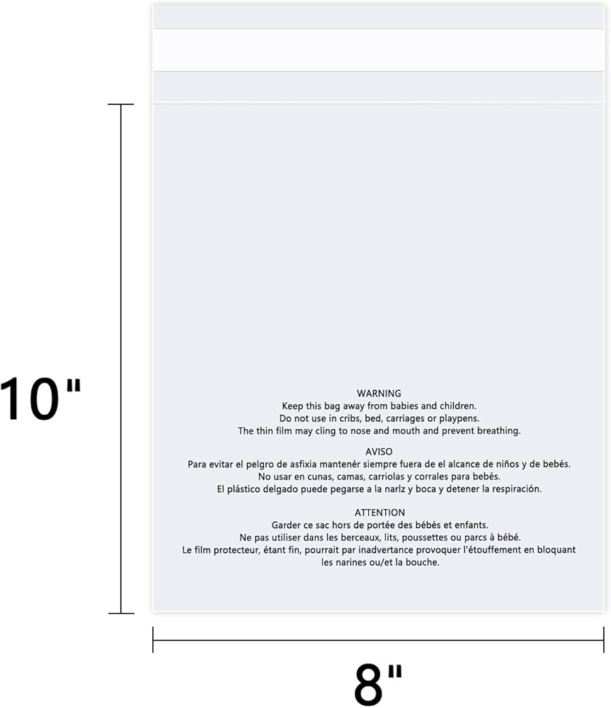 [Specifications]- 500 Pcs - 8" x 10" Usable Dimension (Excludes Glue Flap). 1.6 Mil Thickness poly & plastic packaging bags Printed with Suffocation Warning