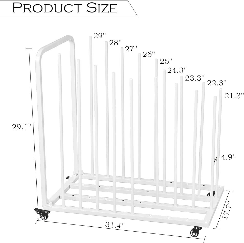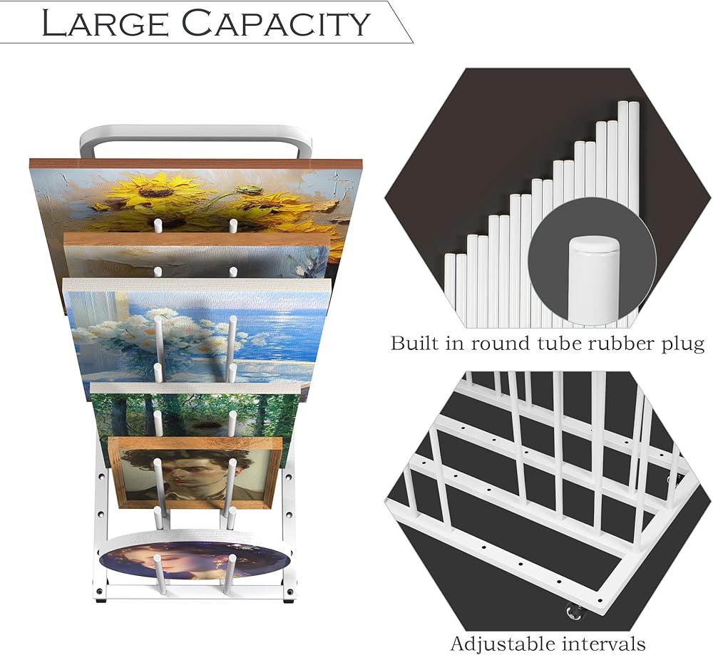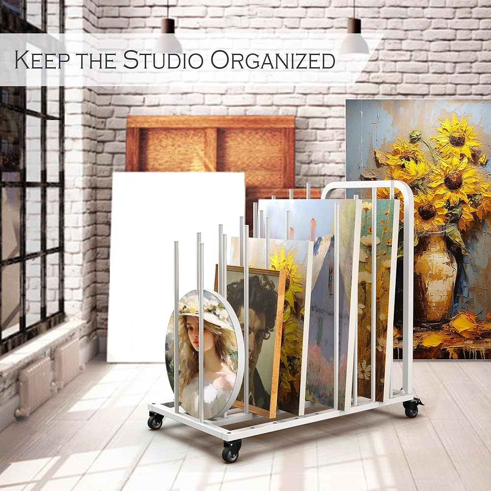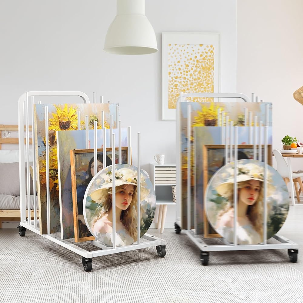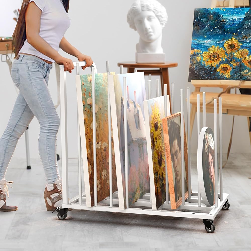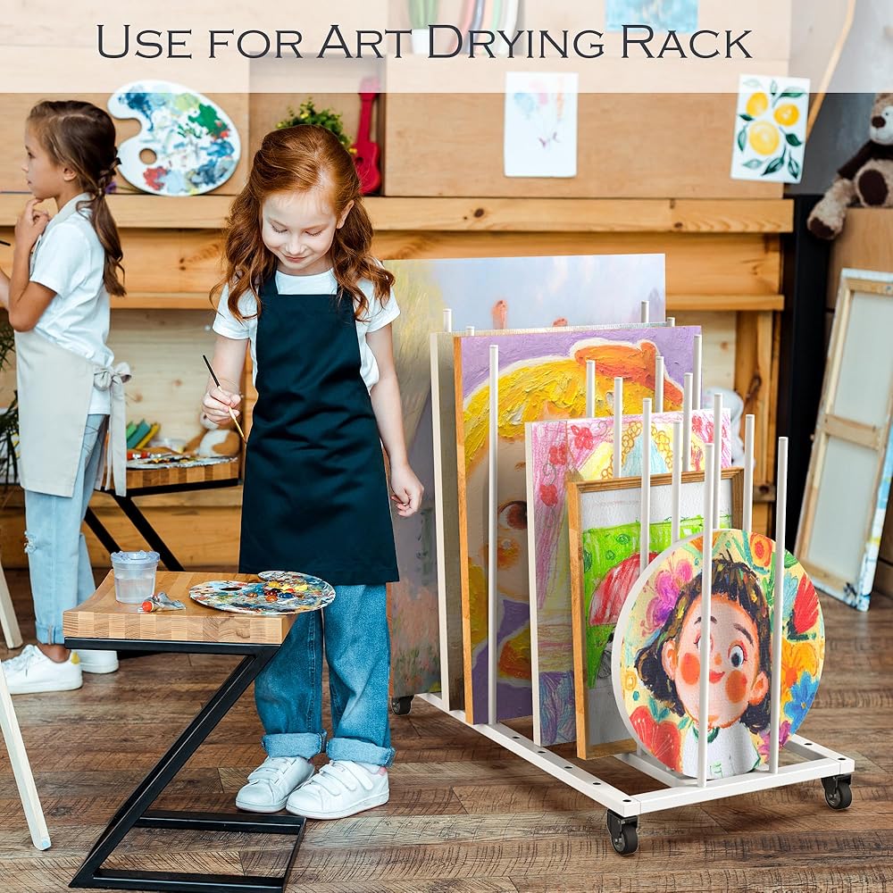 Wide Applicability: This art drying painting rack with wheels is suitable for storing canvas boards, drawing boards, art collections, panels, frames, paper pads, and ect. Save space while making it convenient for you to categorize artworks