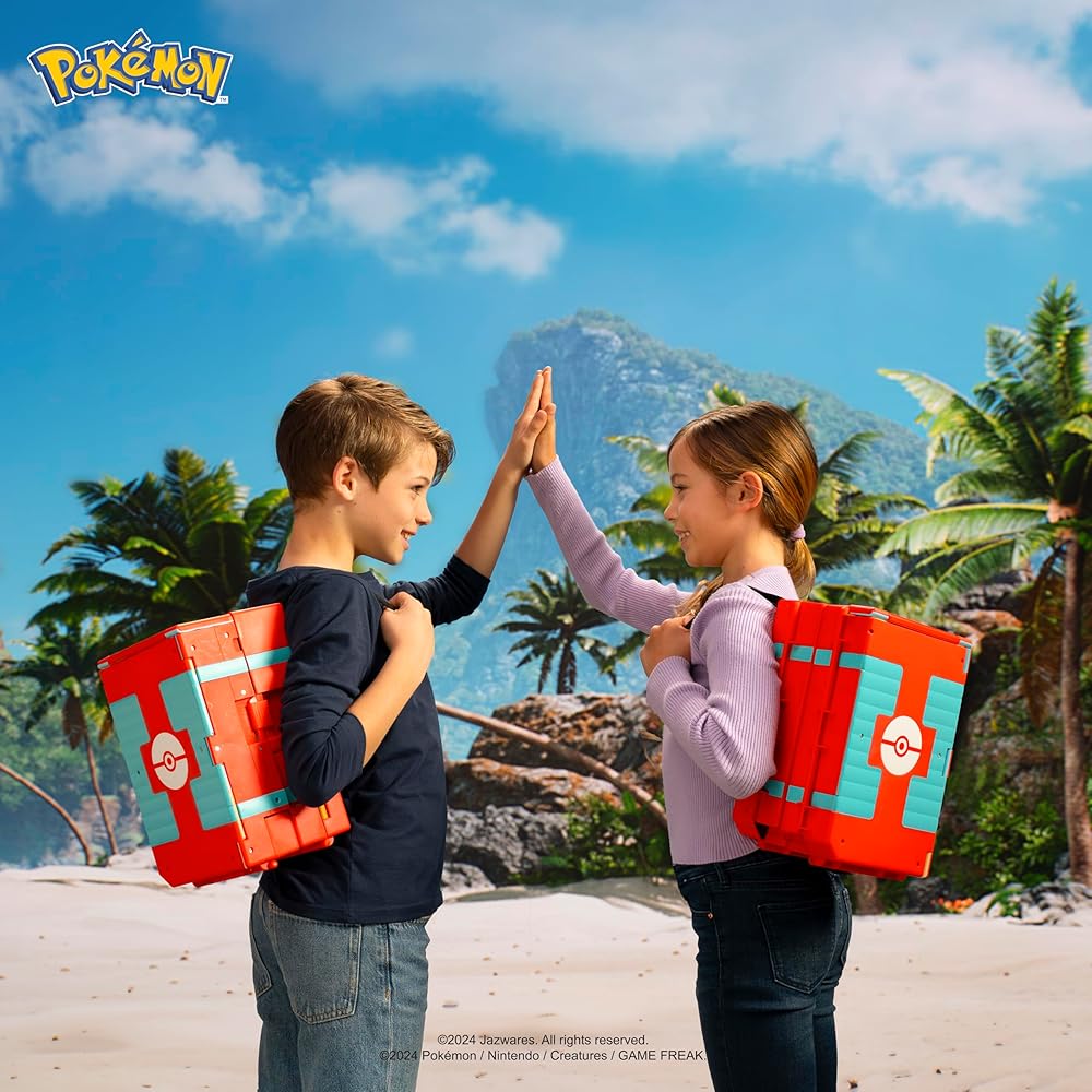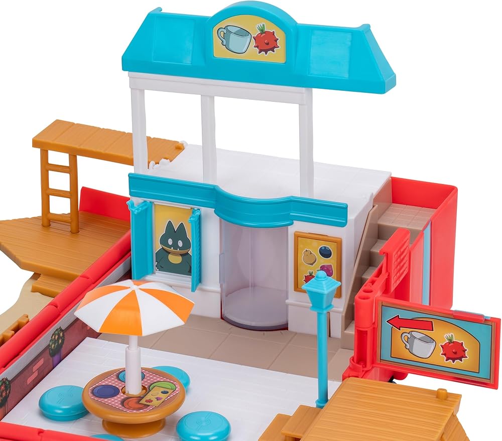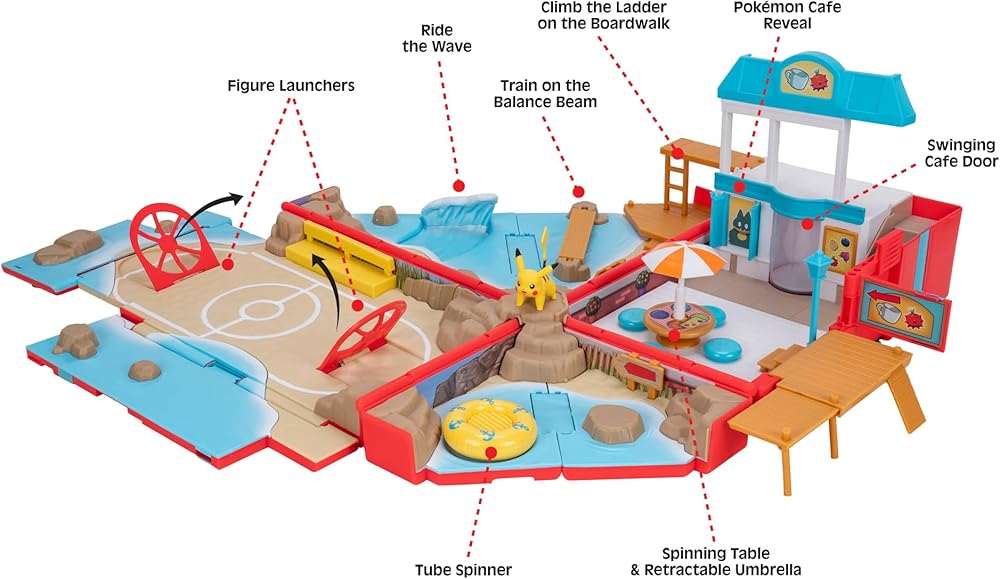Take command in the sand with the Pokémon Carry Case Beach Battle Playset. This portable playset unfolds from a compact backpack into a stunning waterfront environment and includes four unique play zones. Take the included 2-inch Pikachu Battle Figure on a stroll down the boardwalk and have a snack at the town cafe. Then, head down to the beach and play in the tidal wave pool or walk across the balance beam. From there, climb over the rock wall to enter the beachside battle gym and use the launchers to challenge your rivals. Finally, lay out in the water tube and relax in the sun until you're ready to pack it in. When you're done, the playset will neatly transform back into a backpack and you can bring it along on your next adventure. Compatible with any battle ready 2-inch Pokémon Battle Figure (sold separately). Officially licensed by Jazwares. Ages 4+