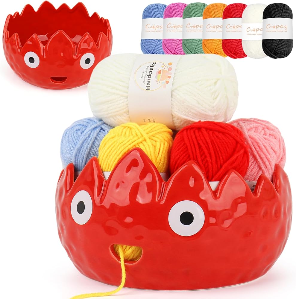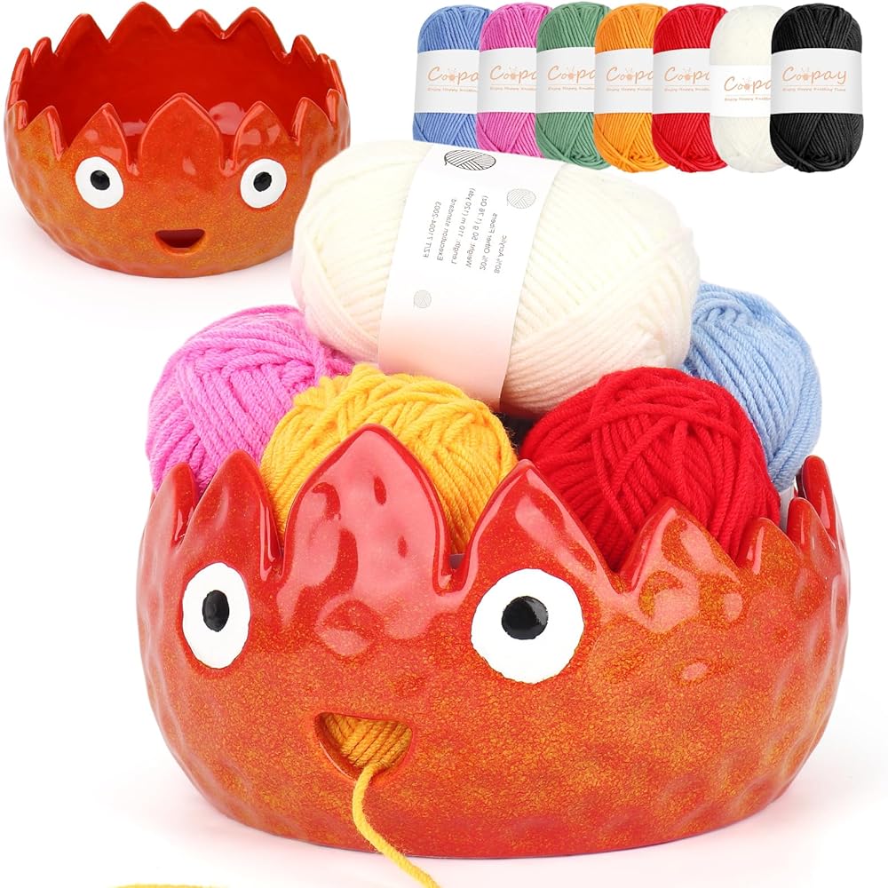 Coopay Flame Yarn Bowl for Crocheting/Knitting, Cute Yarn Storage Bowl with 7PCS Yarn, Large Size Ceramic Yarn Bowl Crochet Knitting Bowl for Beginners, Great Knitting Crochet Gift (7in)