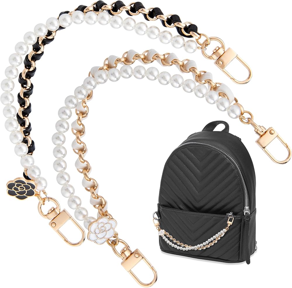 2Pcs Pearl Purse Extender Chain, Black White Flower Bag Charm Handle, 10.2" Pearl Short Straps Replacement Decoration for Crossbody Bags, Handbags, Accessories for Bags with Metal Buckles