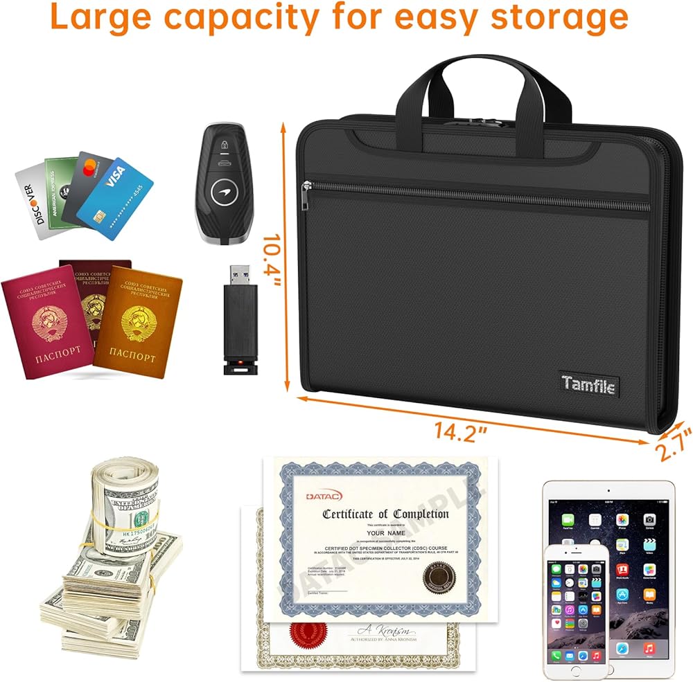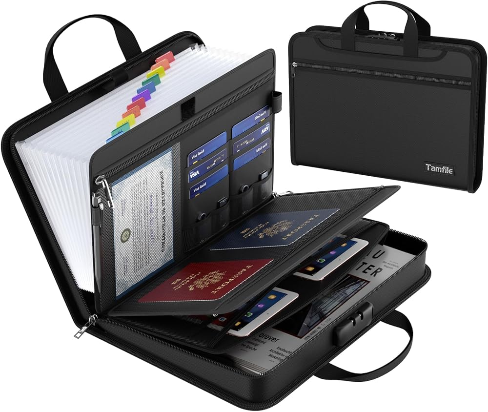 [Large capacity & multiple pockets] Tamfile gives you more capacity than other products. It contains a 13 accordion document pocket with labels, three zipper pockets, one expandable pocket, three passport-sized pockets, 2 pen slots, with 6 card slots + 4 USB slots and attached small mesh pocket. You can safely store important documents while efficiently categorizing and finding them.