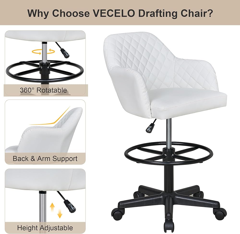 Drawing Chair with Smooth-rolling Wheels: The high desk chair's 360° swivel design ensures effortless communication, while the smooth-rolling casters allow seamless movement on wood floors, tiles, and carpets without scratching. This drafting chair tall office chair for standing desk prioritizes mobility and ease of use.