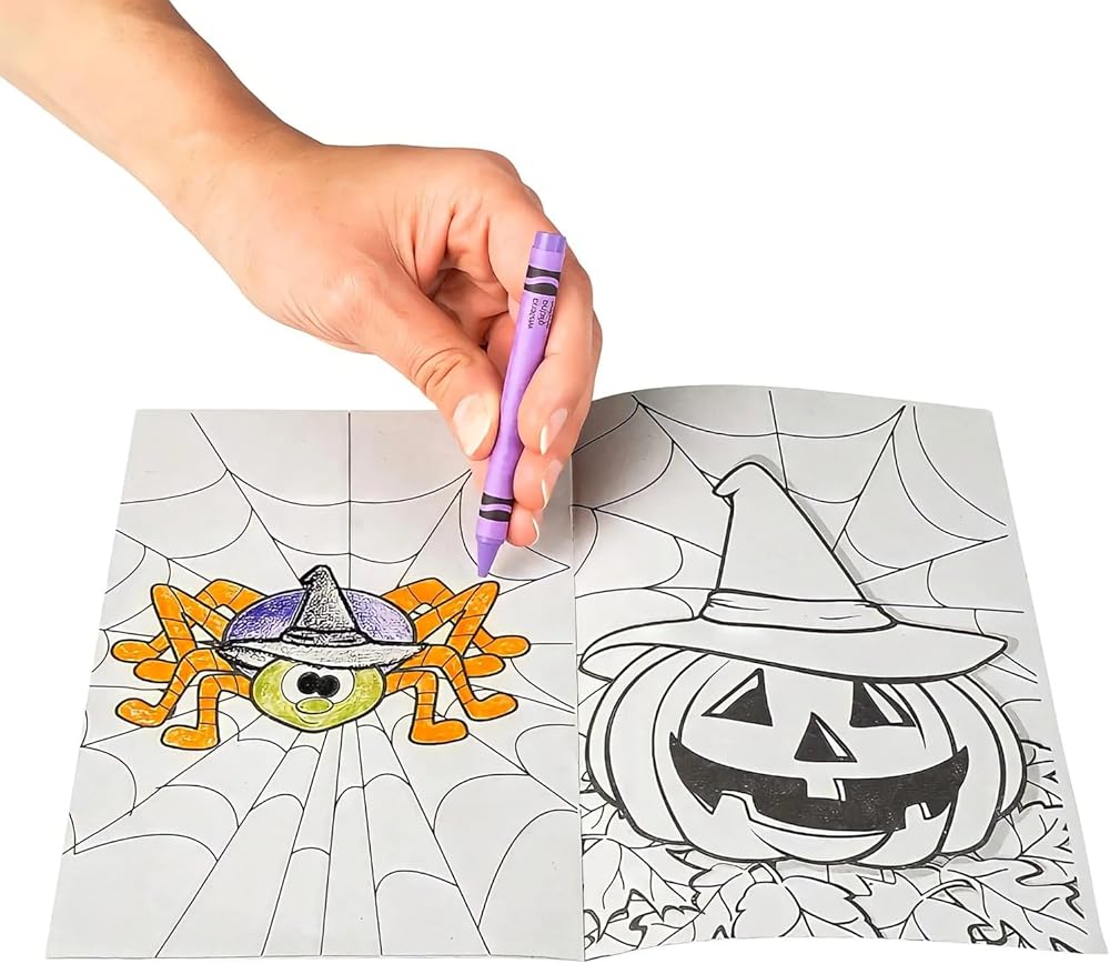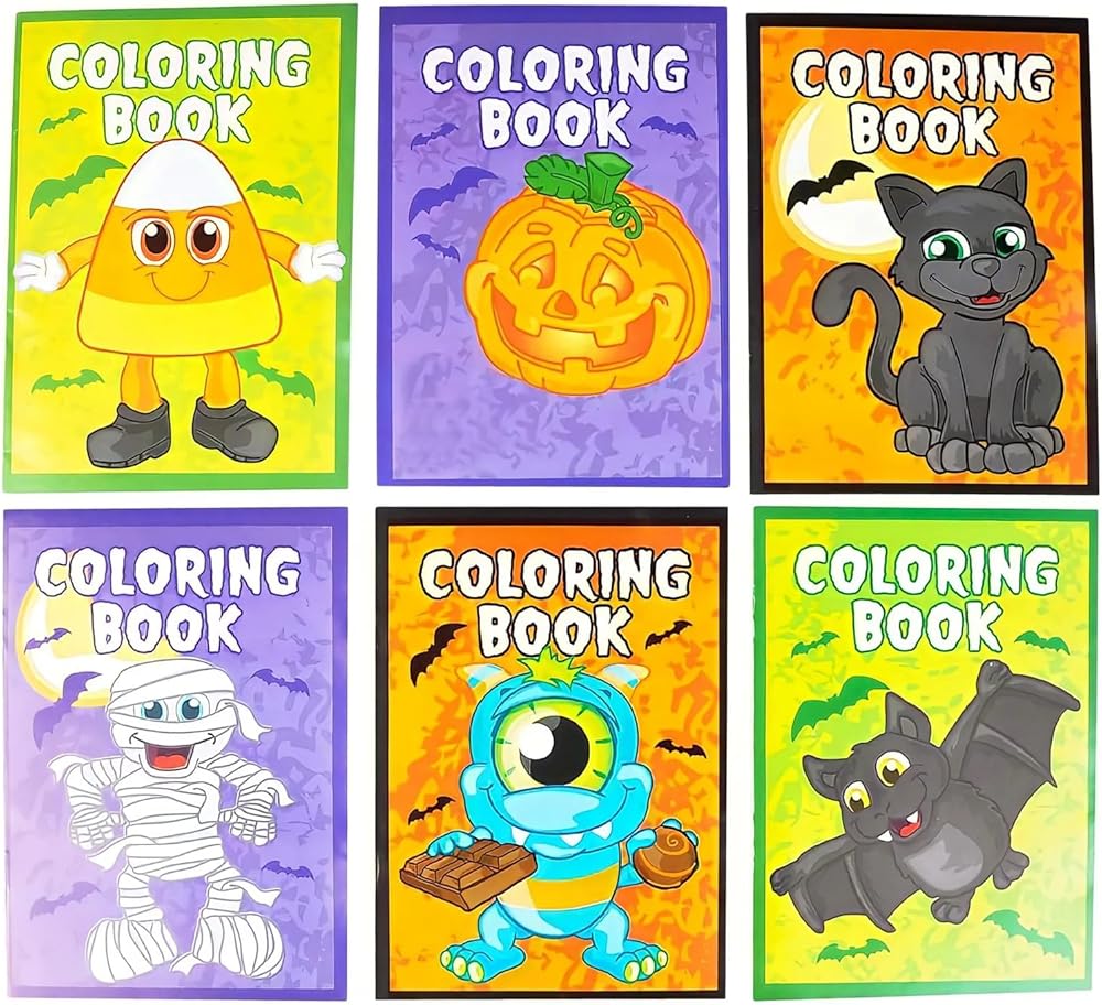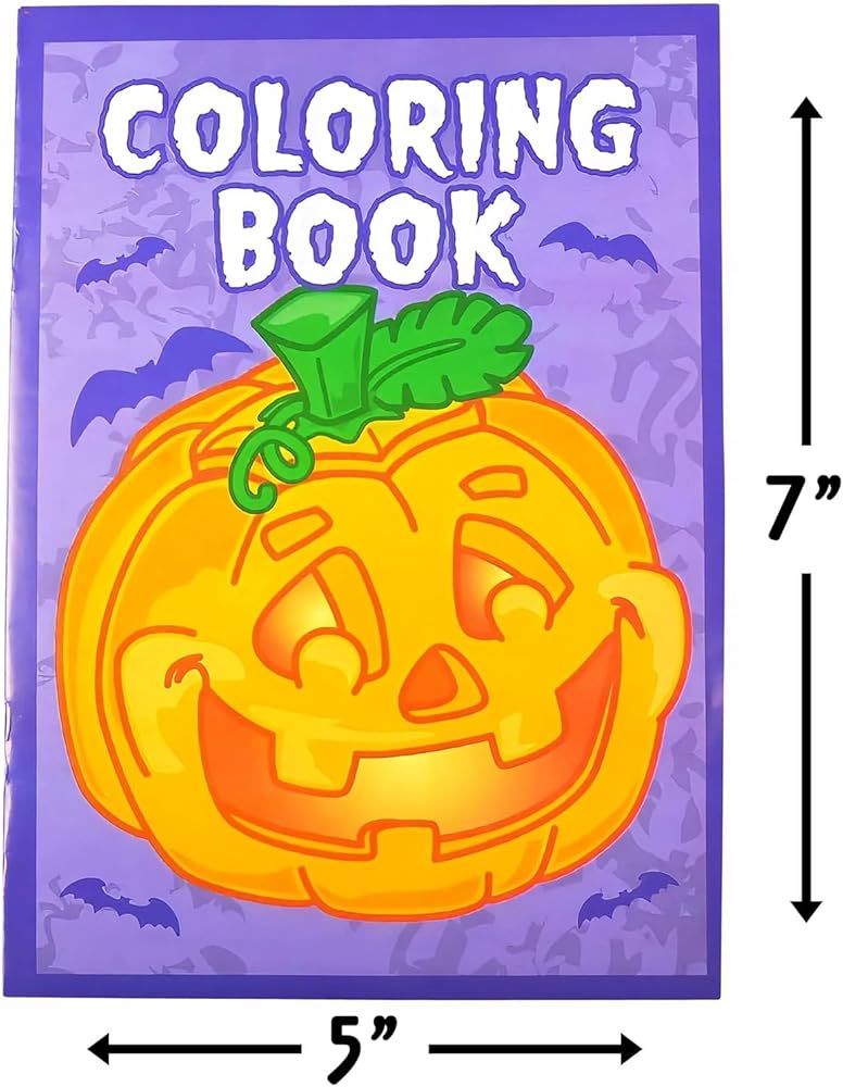 Halloween coloring book Measures 5" x 7" Variety of Halloween-themes One dozen in polybag with printed header Sold by the unit 6 dozen polybags per unit Ages 4+