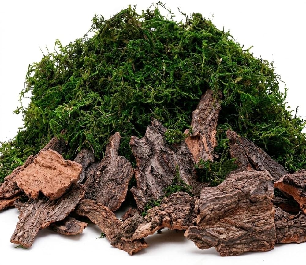 Approximately 8oz., including 4OZ Green Moss for crafts and 4OZ tree bark for fairy garden decor.Use in floral decor, floral arrangements, vase decoration, bouquets, fairy gardens, terrariums, DIY crafts etc.
