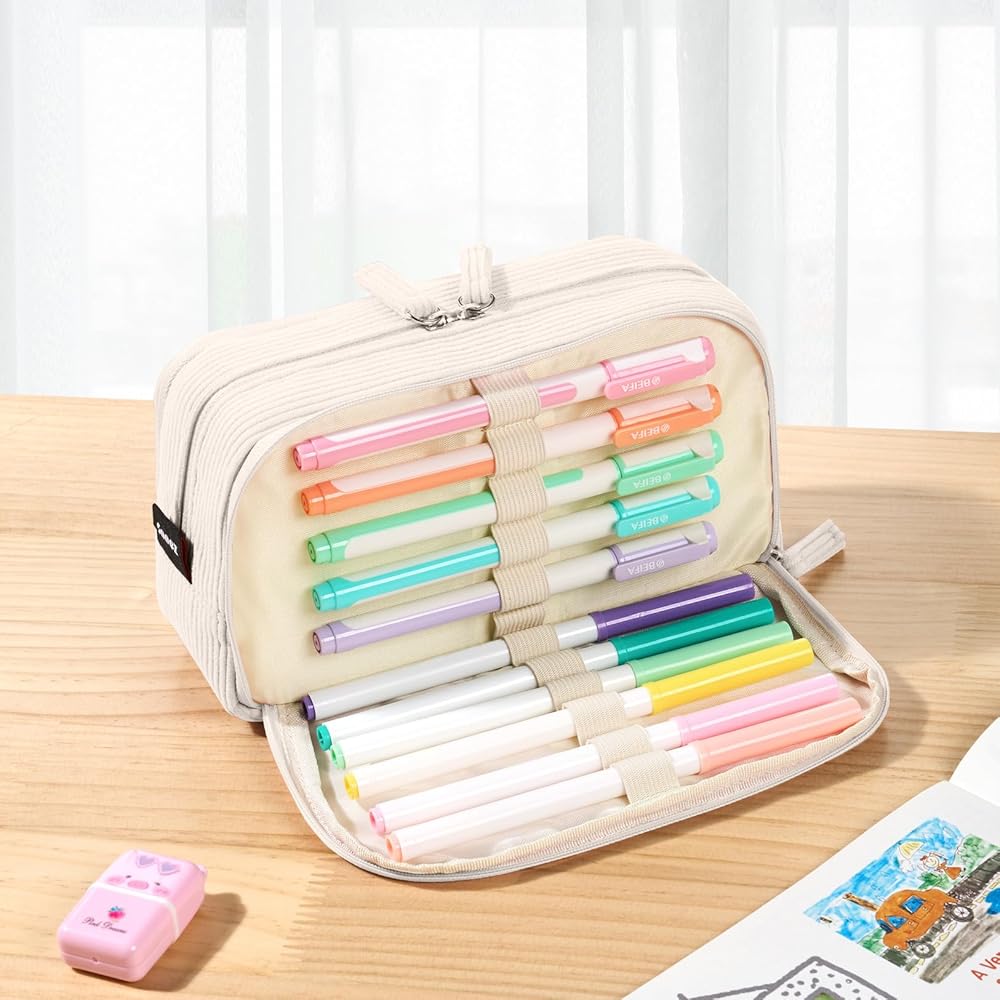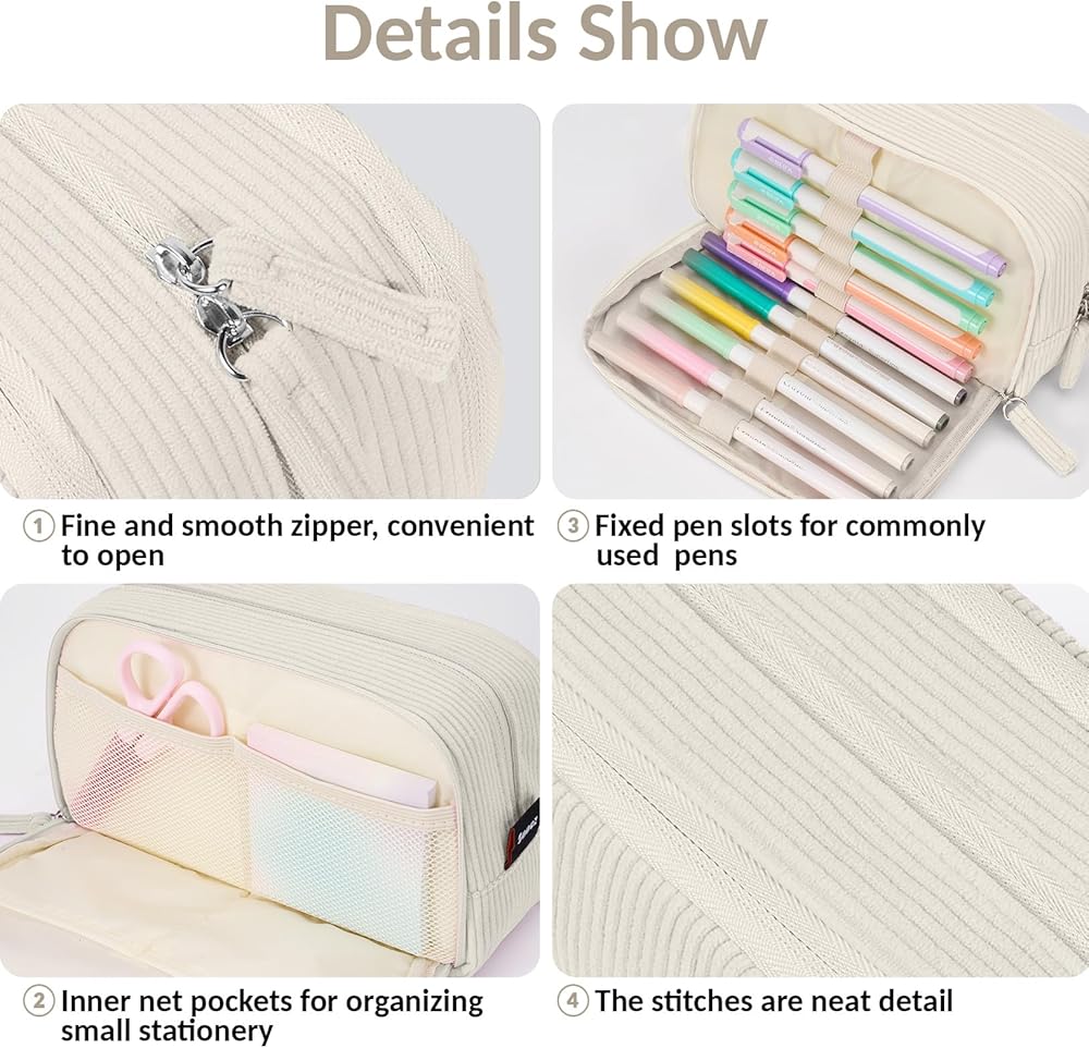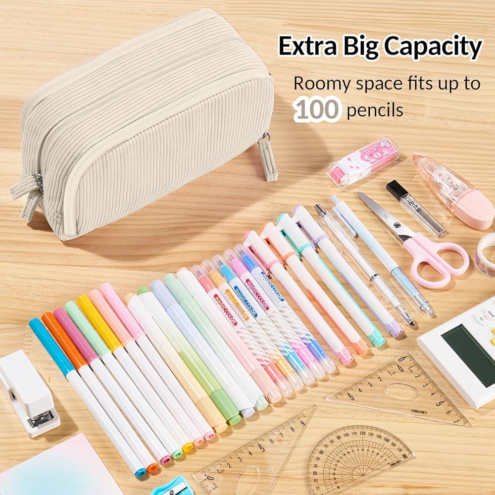 Sooez Big Capacity Pencil Case Pen Pouch, Soft Corduroy Pencil Bag with 3 Compartment, Multiple Pockets, Sturdy Zipper, Cute School Supplies Pen Bag Organizer For Teen Girls College, Beige