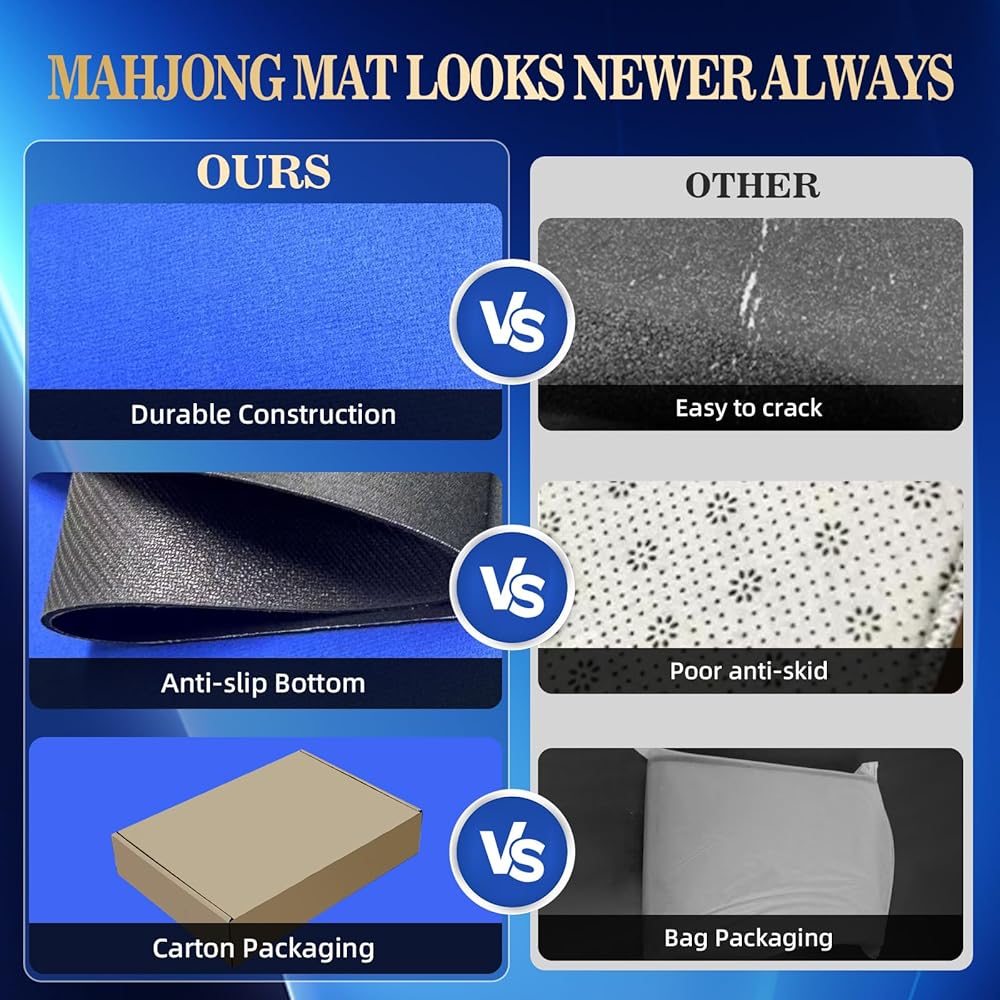 [DURABLE BOX PACKING & REDUCE CREASES] Our product comes in a high-quality square box, not use flimsy bags. This packaging reduces creases by up to 90%. Additionally, the mahjong mat is made from a new material, ensuring that any creases will bounce back easily. Say goodbye to creases!!!