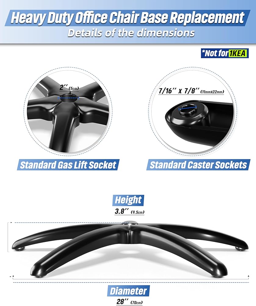 🏆【Universal Base Size】Chair base height: 4.72'' (12cm), Casters: 7/16" x 7/8" (11mm x 22mm), caster height: 2.17'' (5.5cm), Total height: 6.89" (17.5cm), Compatible gas cylinder hole: 2" (5cm). This 24'' office chair replacement base is suitable for most of the market including Herman Miller (office chair, study chair, desk chair, vanity chair). Please confirm the size before making a purchase.
