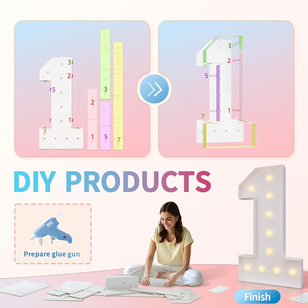 Assembly Needed: Each 4 ft marquee numbers are pre-cut frame with slots, 1) Match the slots on the board and put all boards together by hot glue. 2) Screw the bulbs on the board and install 3 AA batteries. (Noted: Glue gun and batteries are not included)