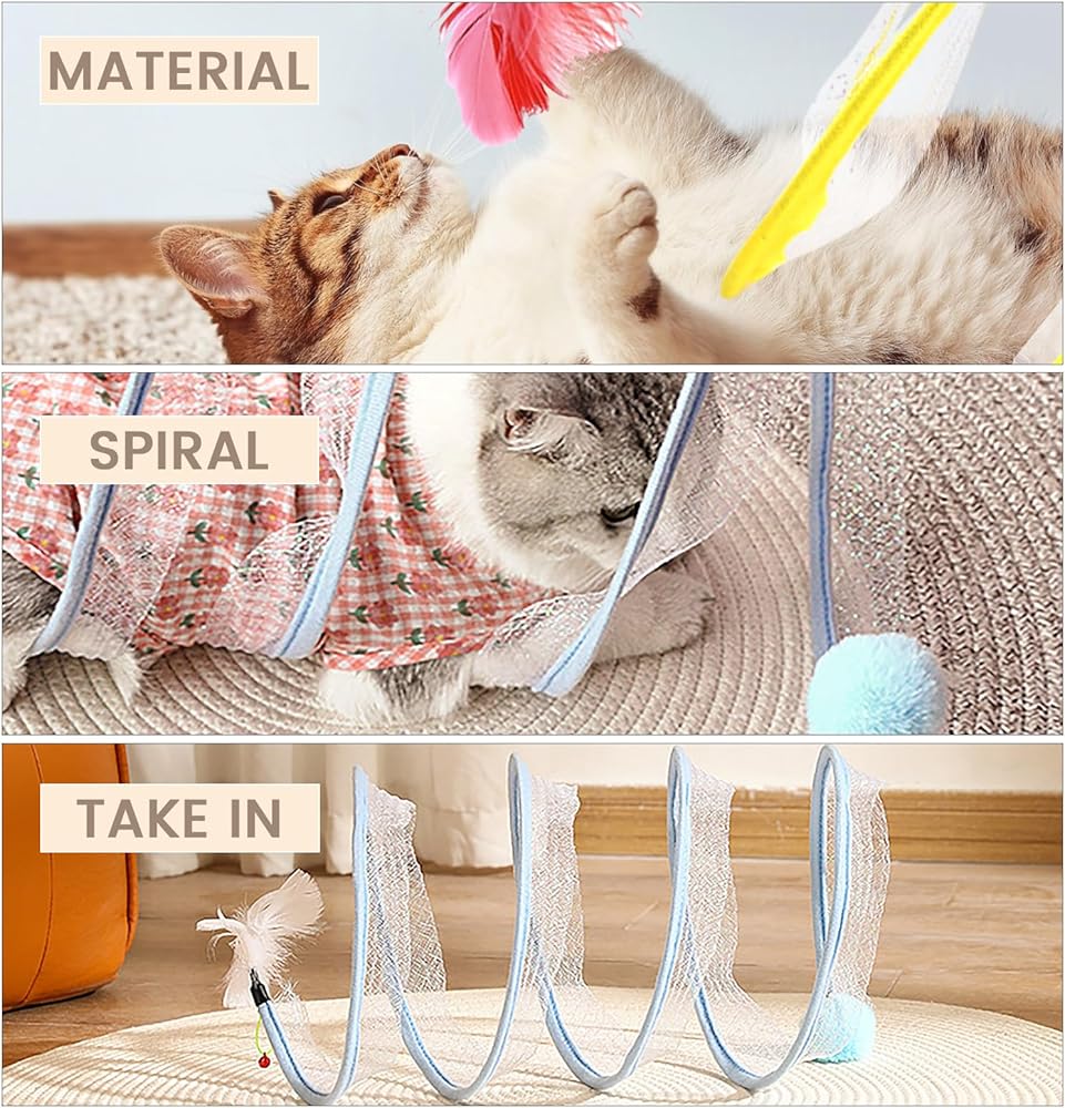 Versatile and Interactive: Our Folded Cat Tunnel Toy is not only a collapsible cat tunnel, but also a teasing wand. The tunnel is adorned with plush mice and feather toys on both sides, which can arouse your cat's curiosity and make it an ideal toy for exploration.